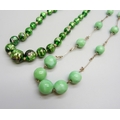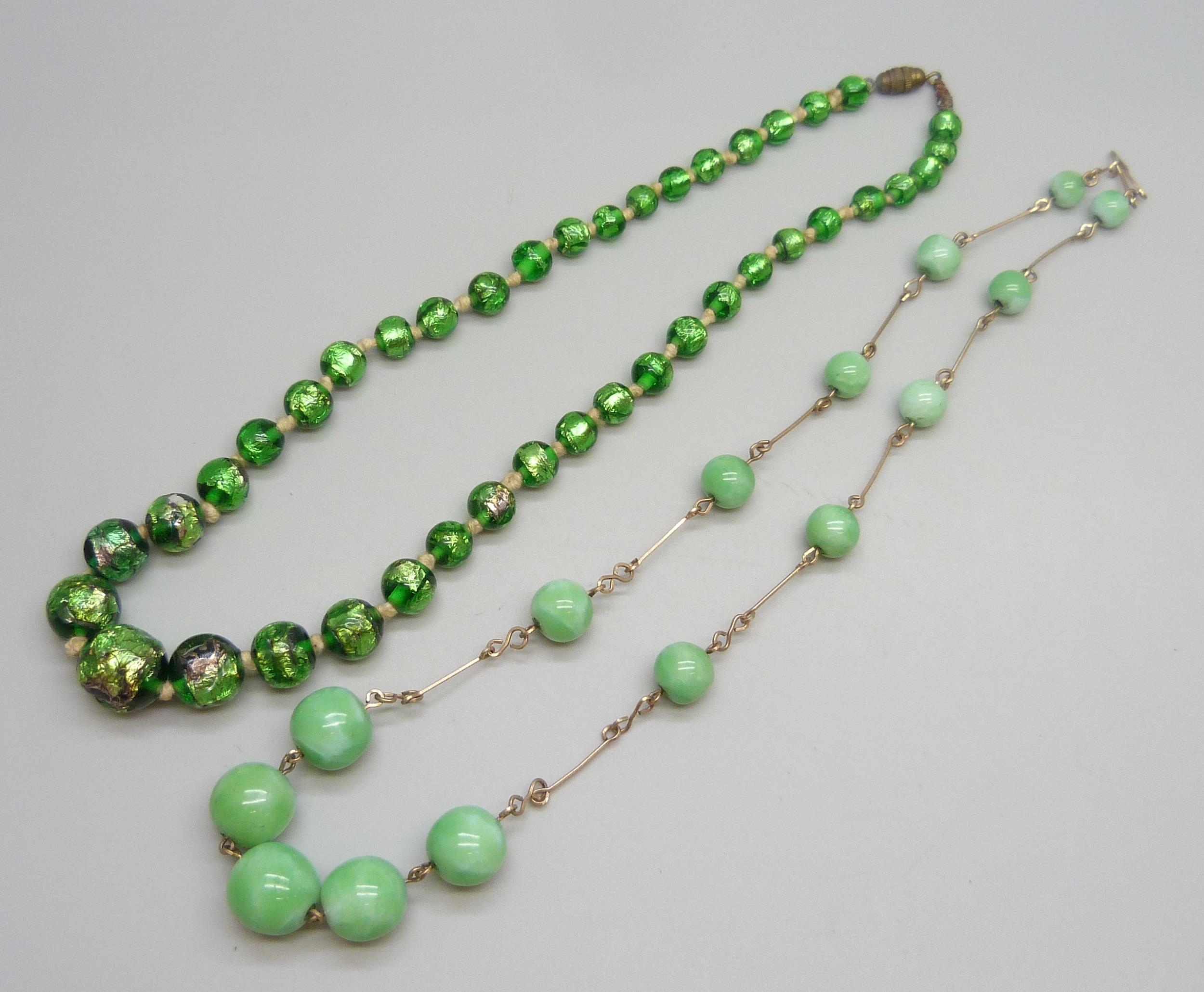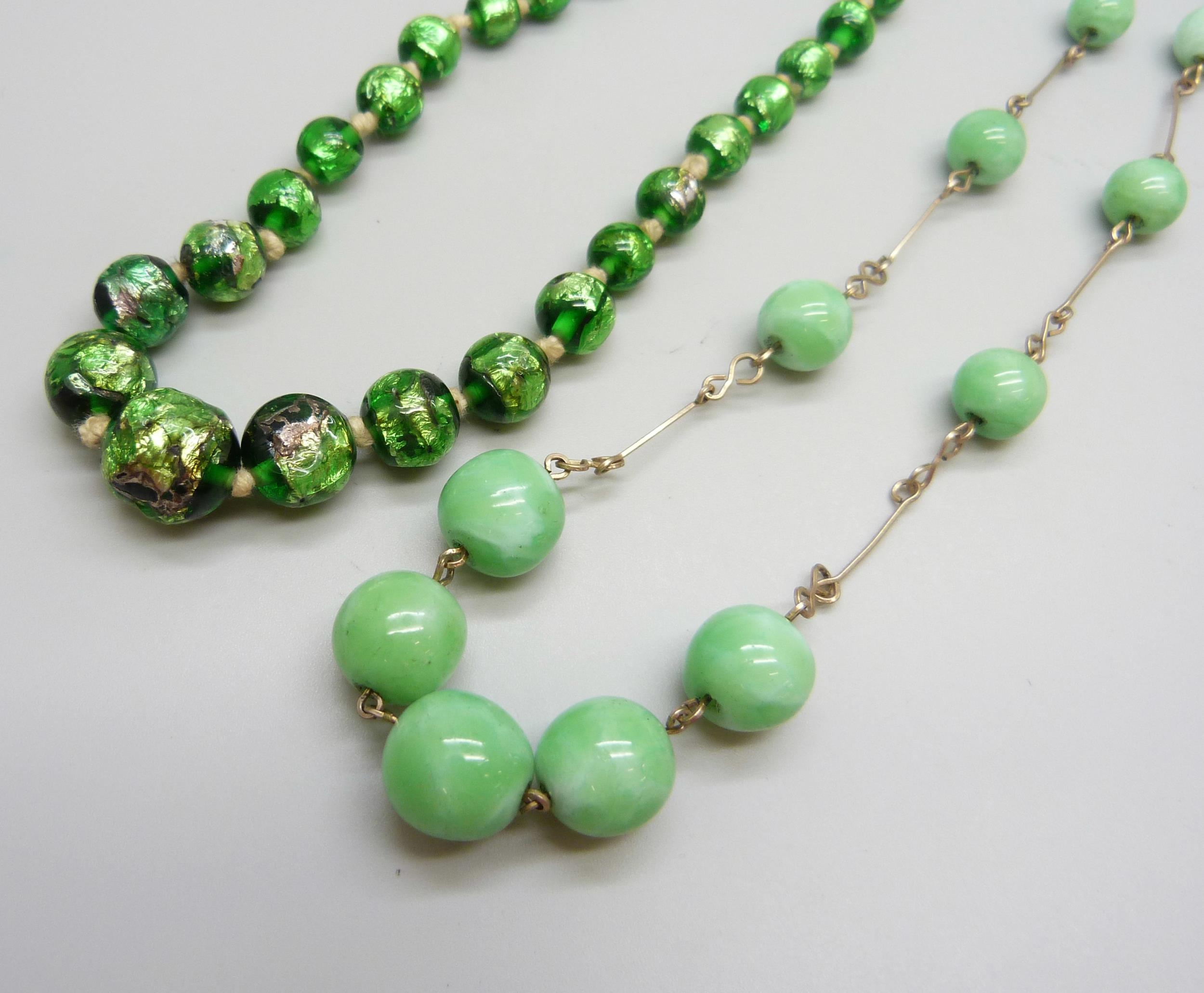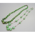 Vintage Art Deco bead necklaces, a green stone example, and a foiled glass example (some links chipped)