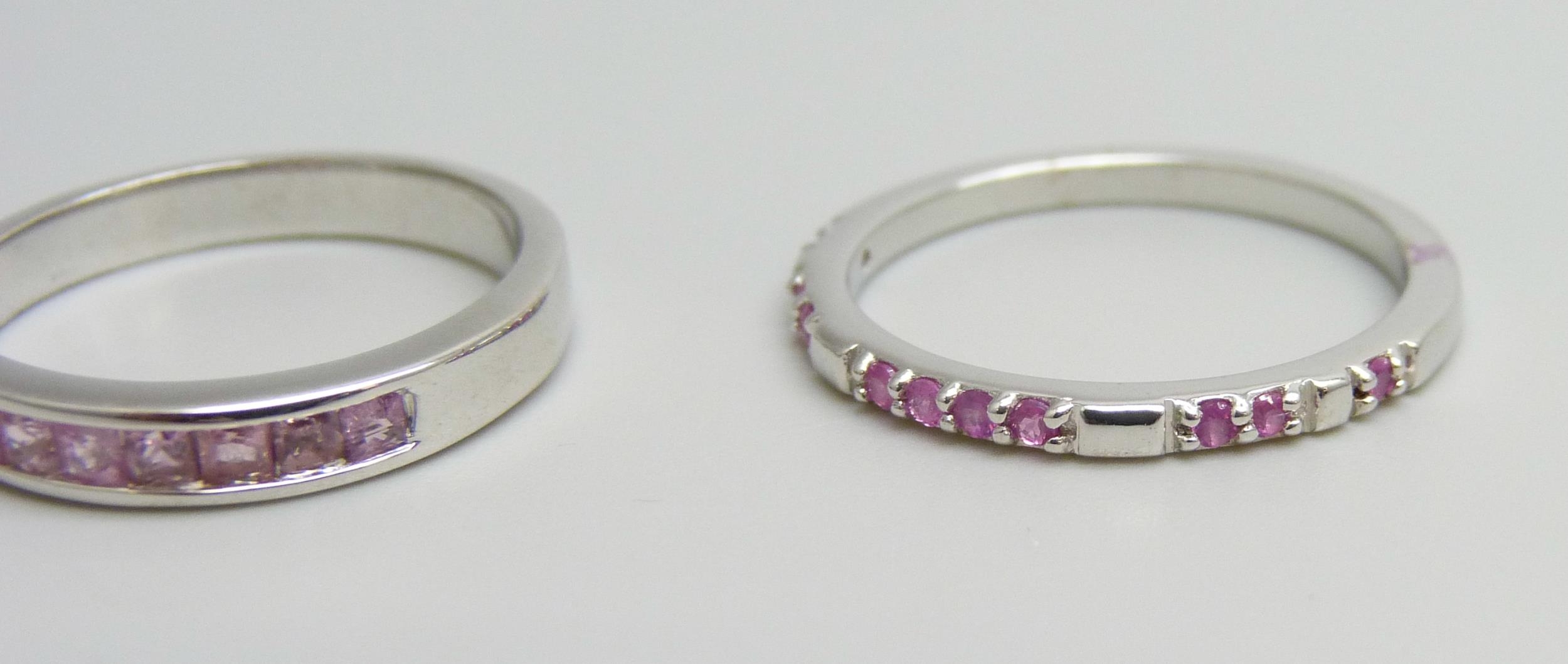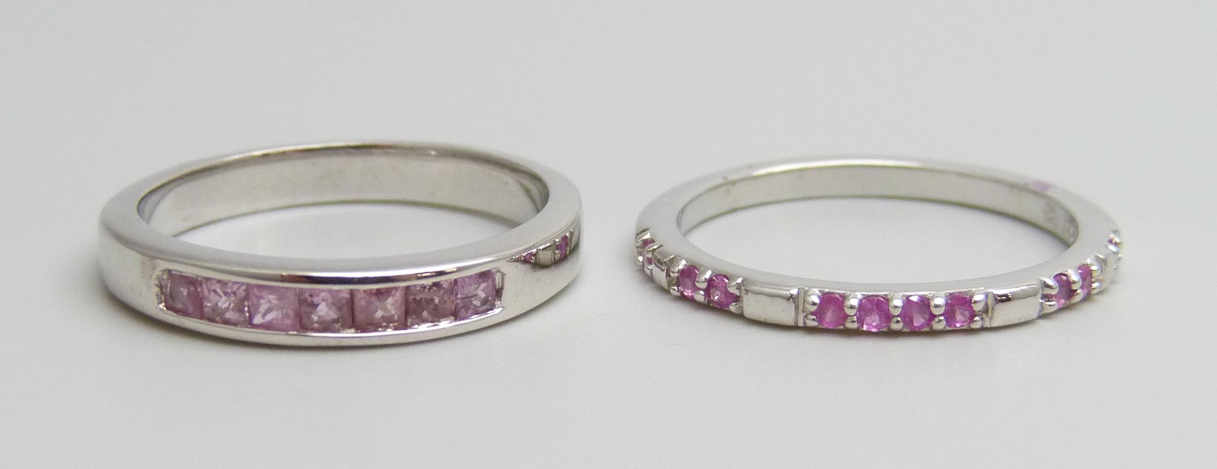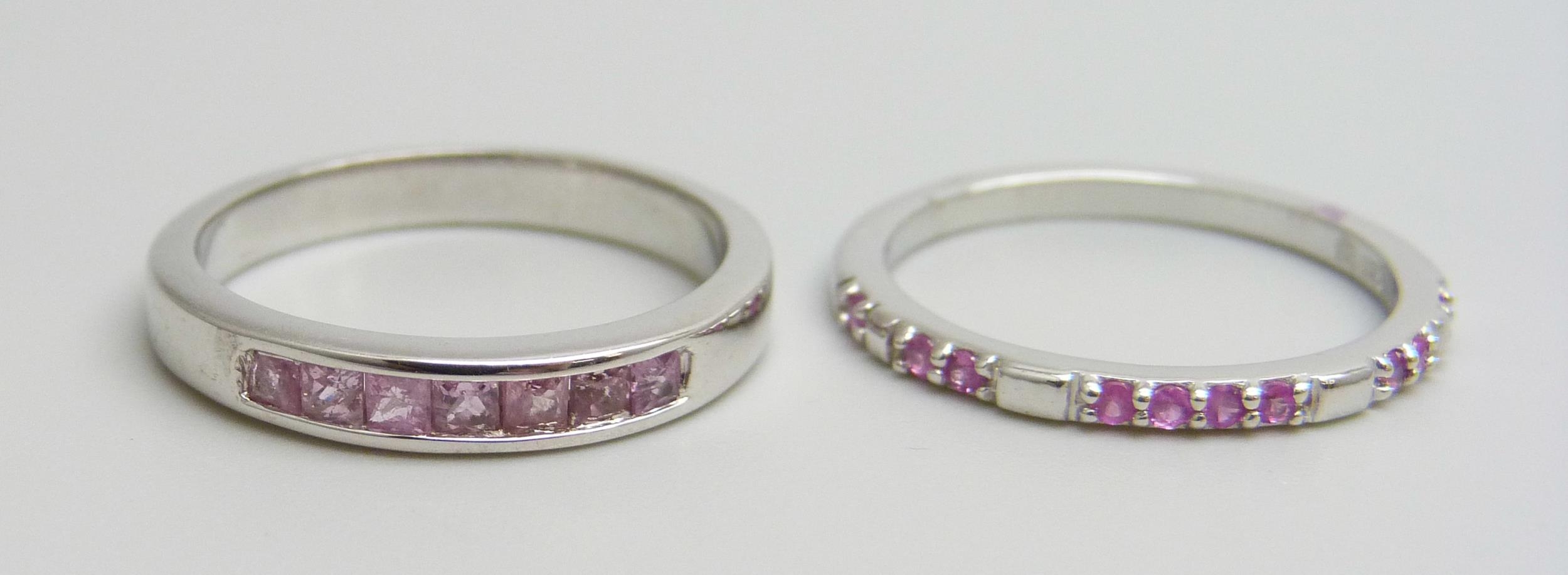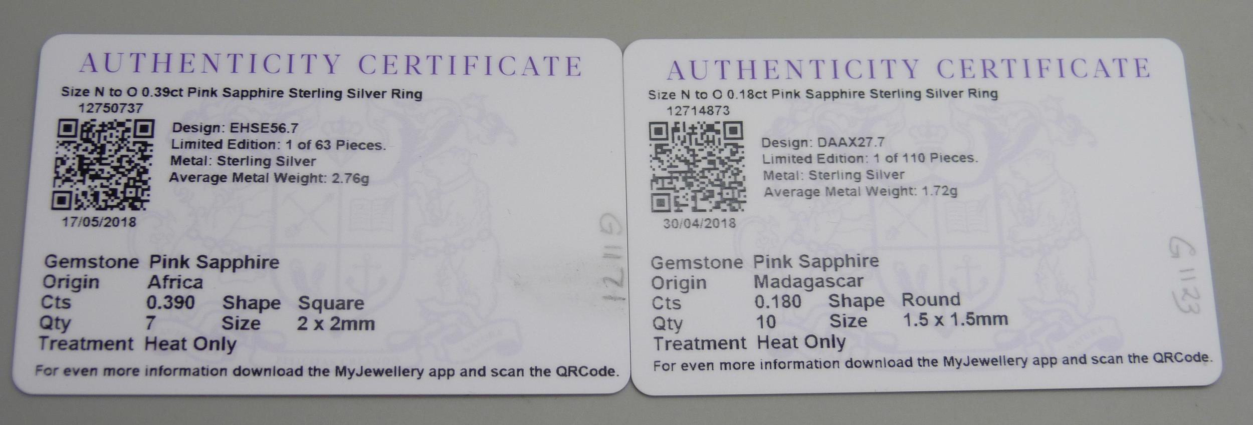 Two silver and pink sapphire rings, 4.3g total, with certificates