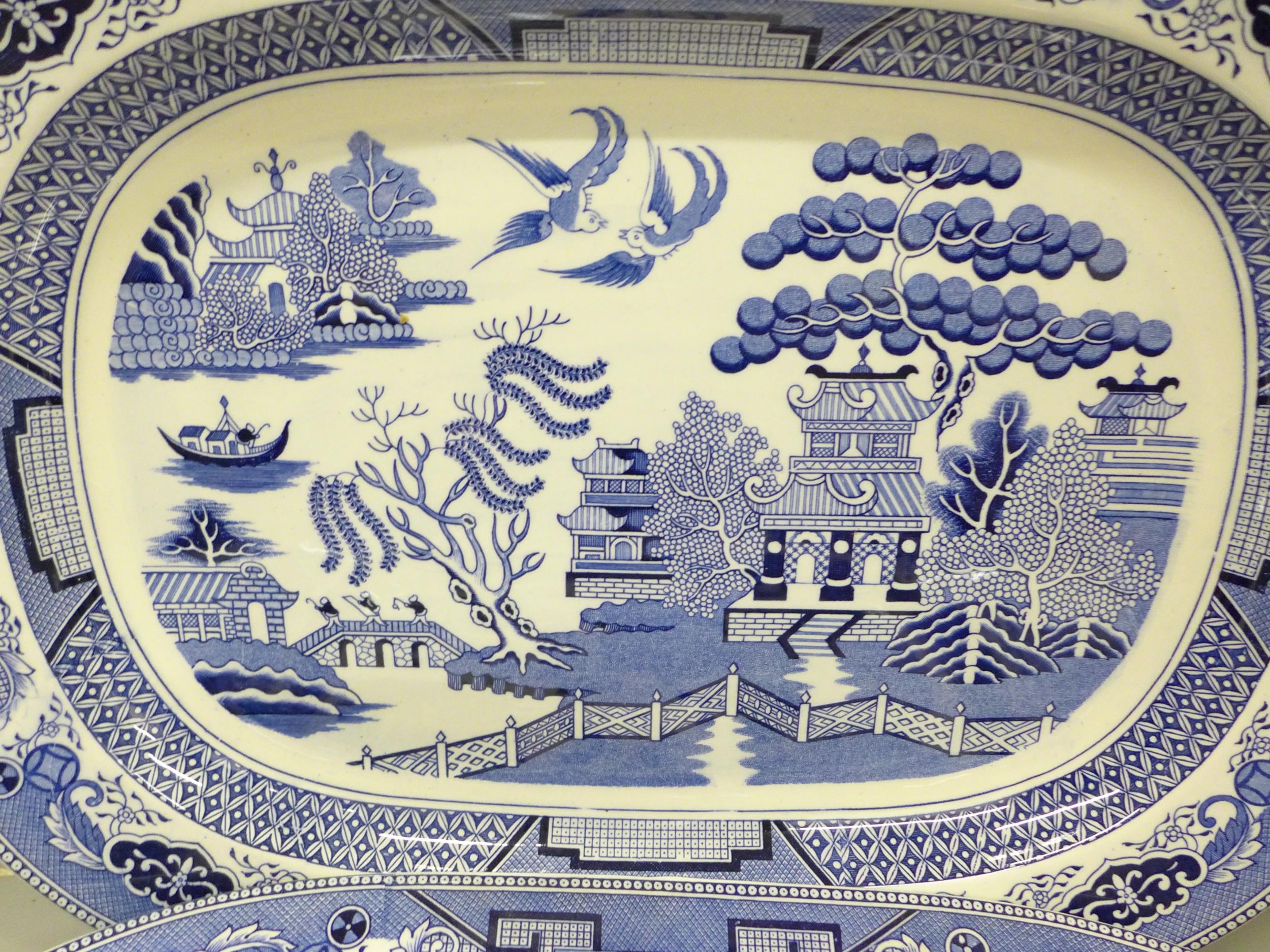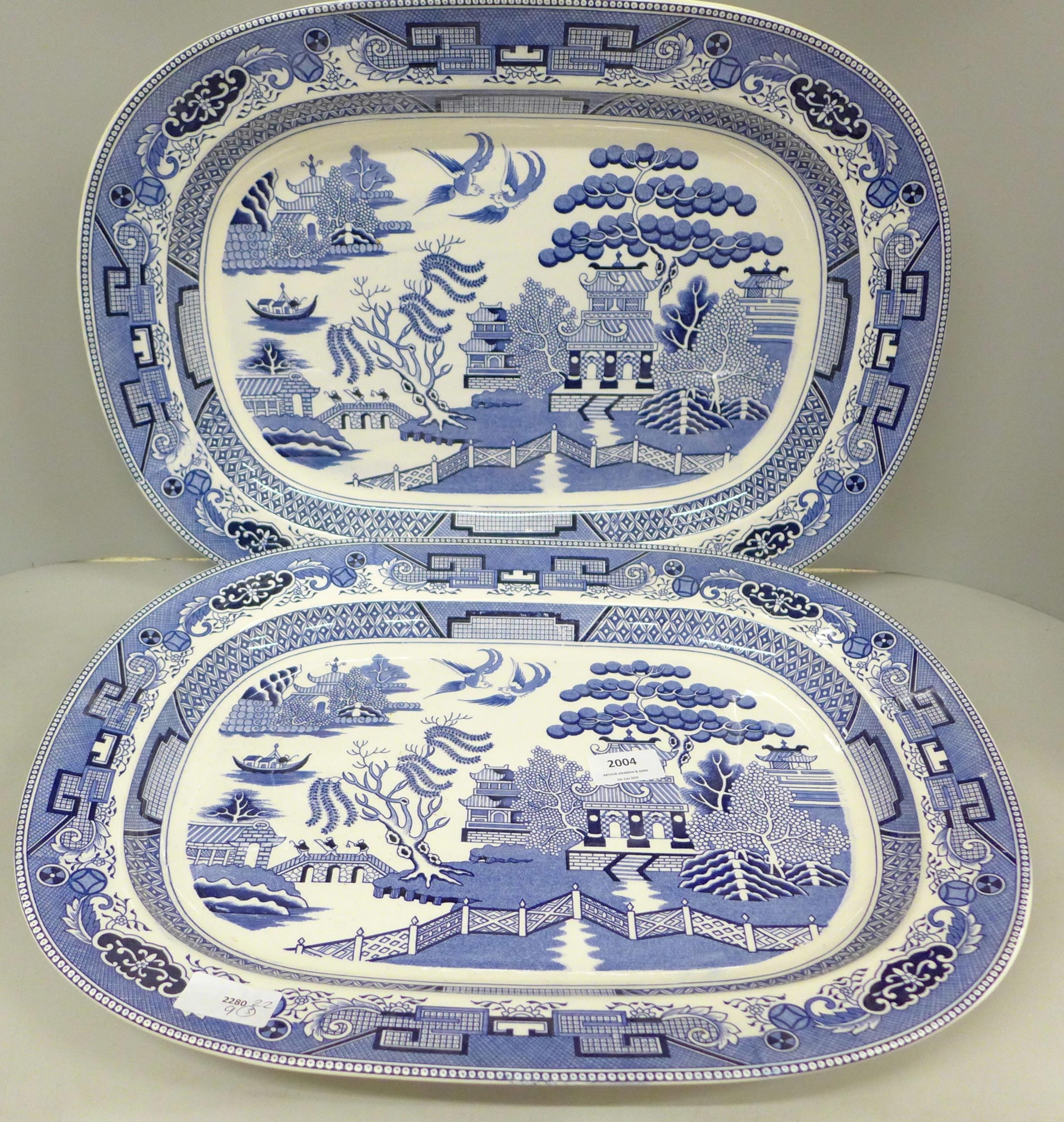 A pair of Staffordshire Willow pattern porcelain meat plates, 47cm