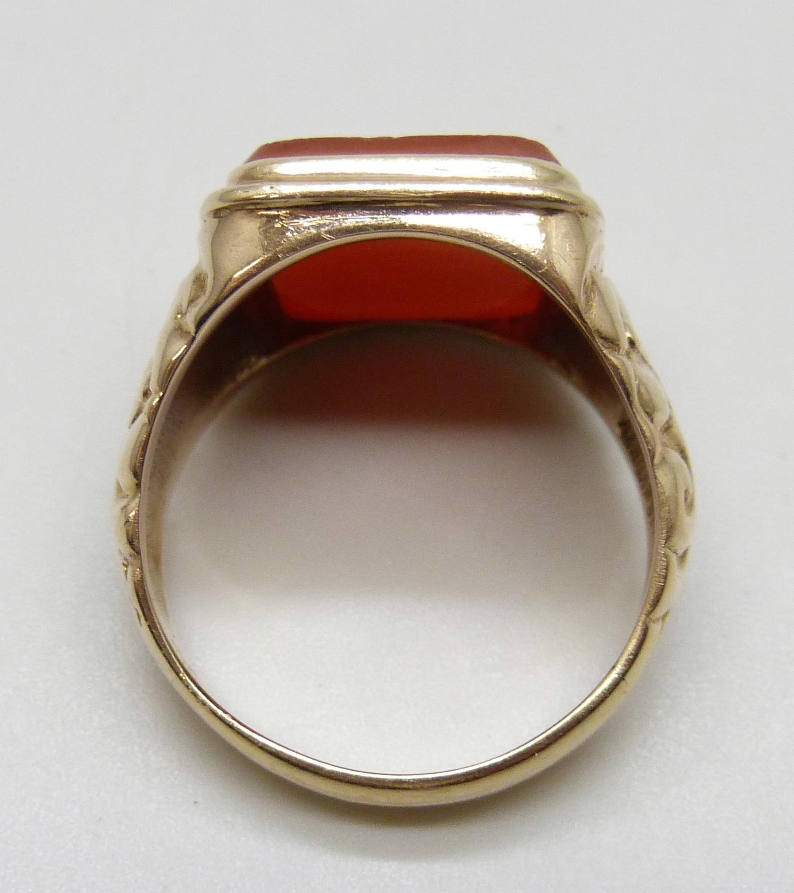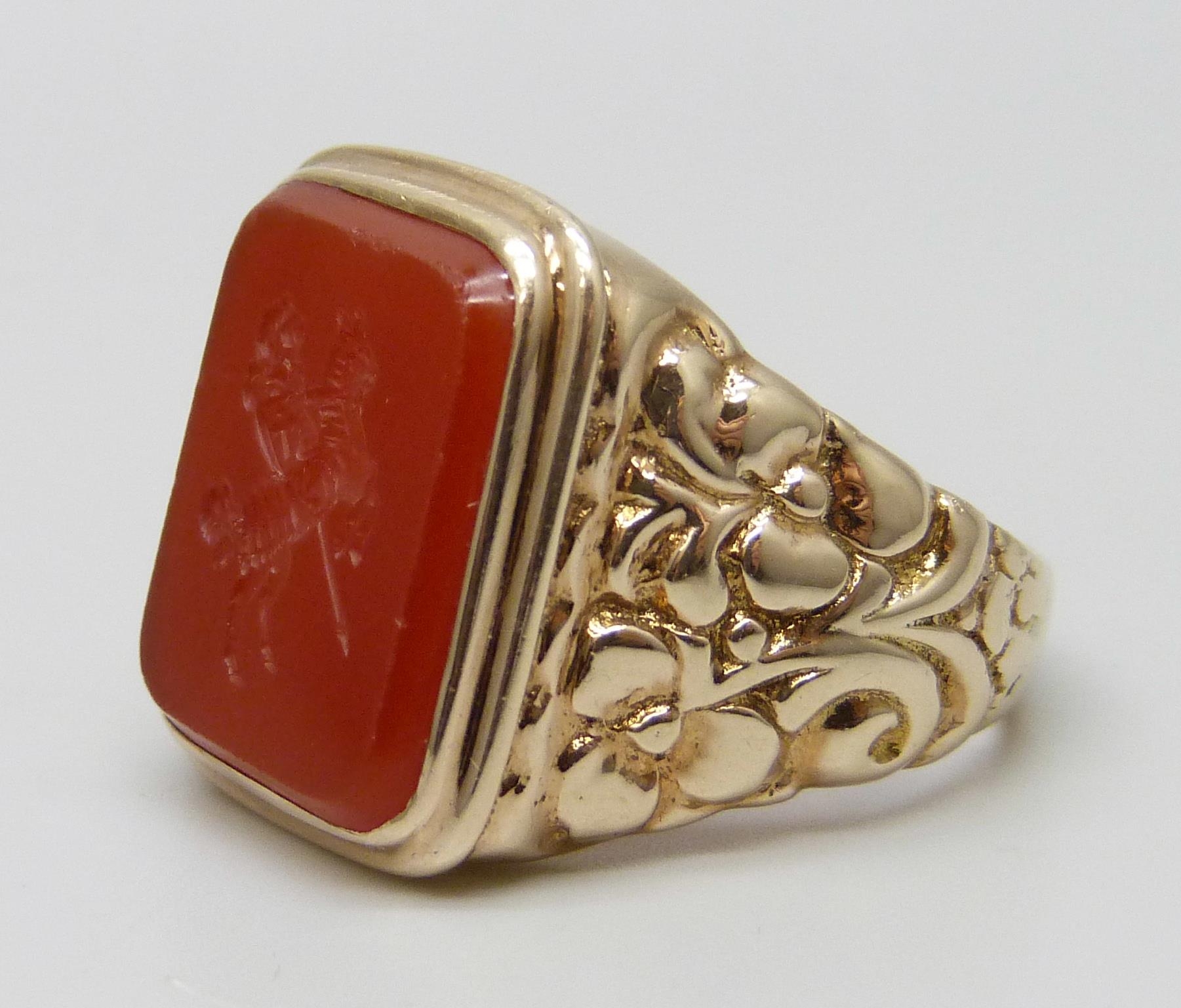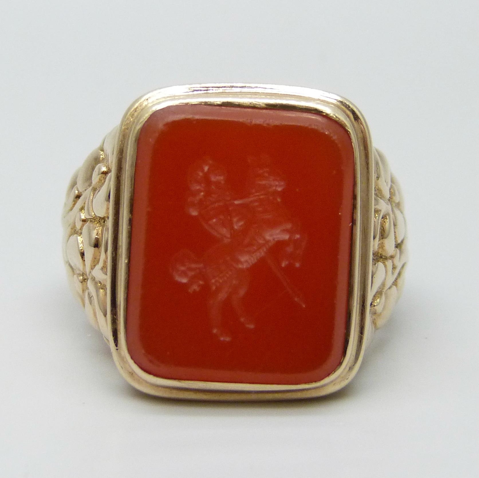 A 9ct gold ring set with a carnelian intaglio seal depicting a knight on horseback, 12.7g, X