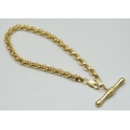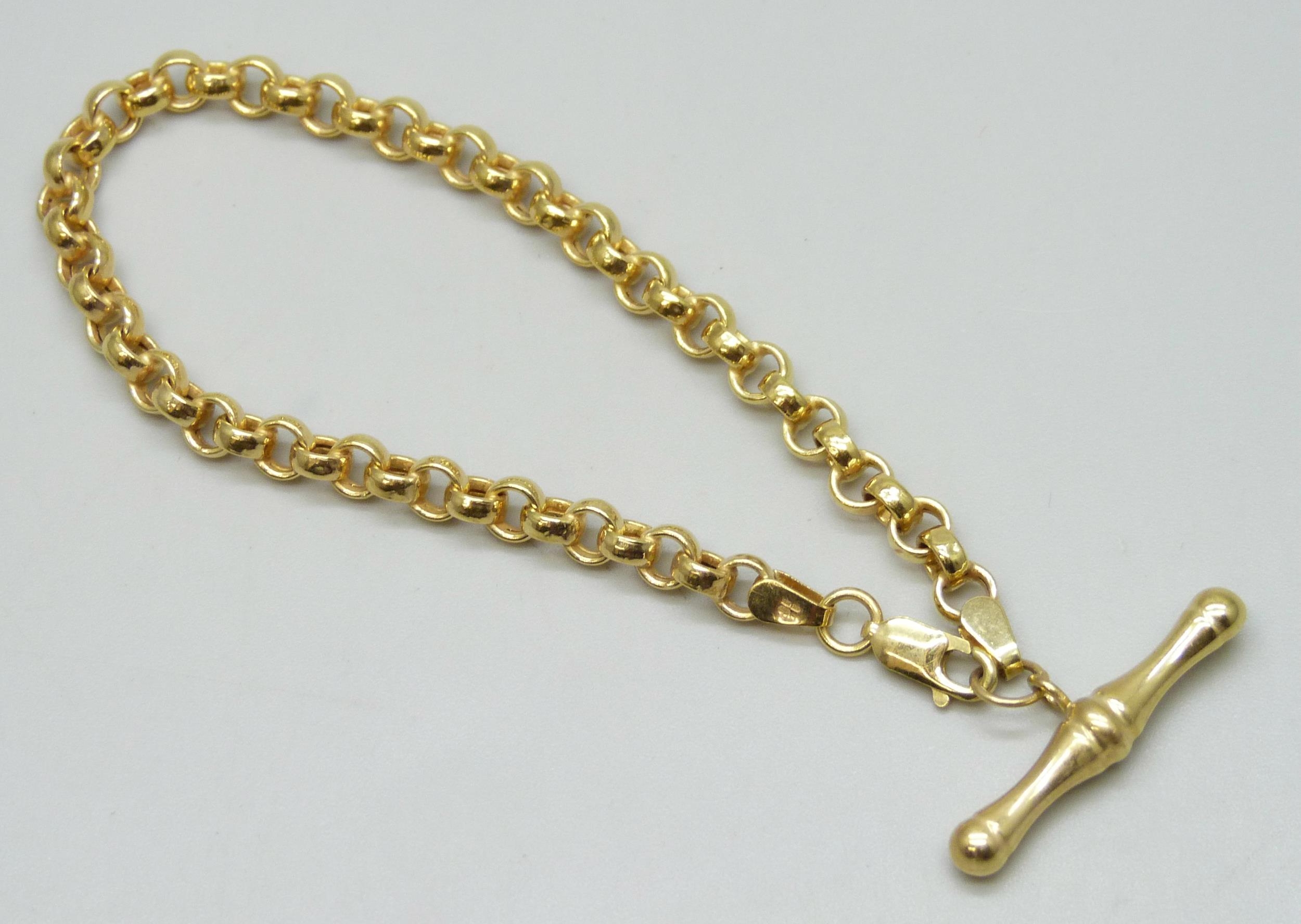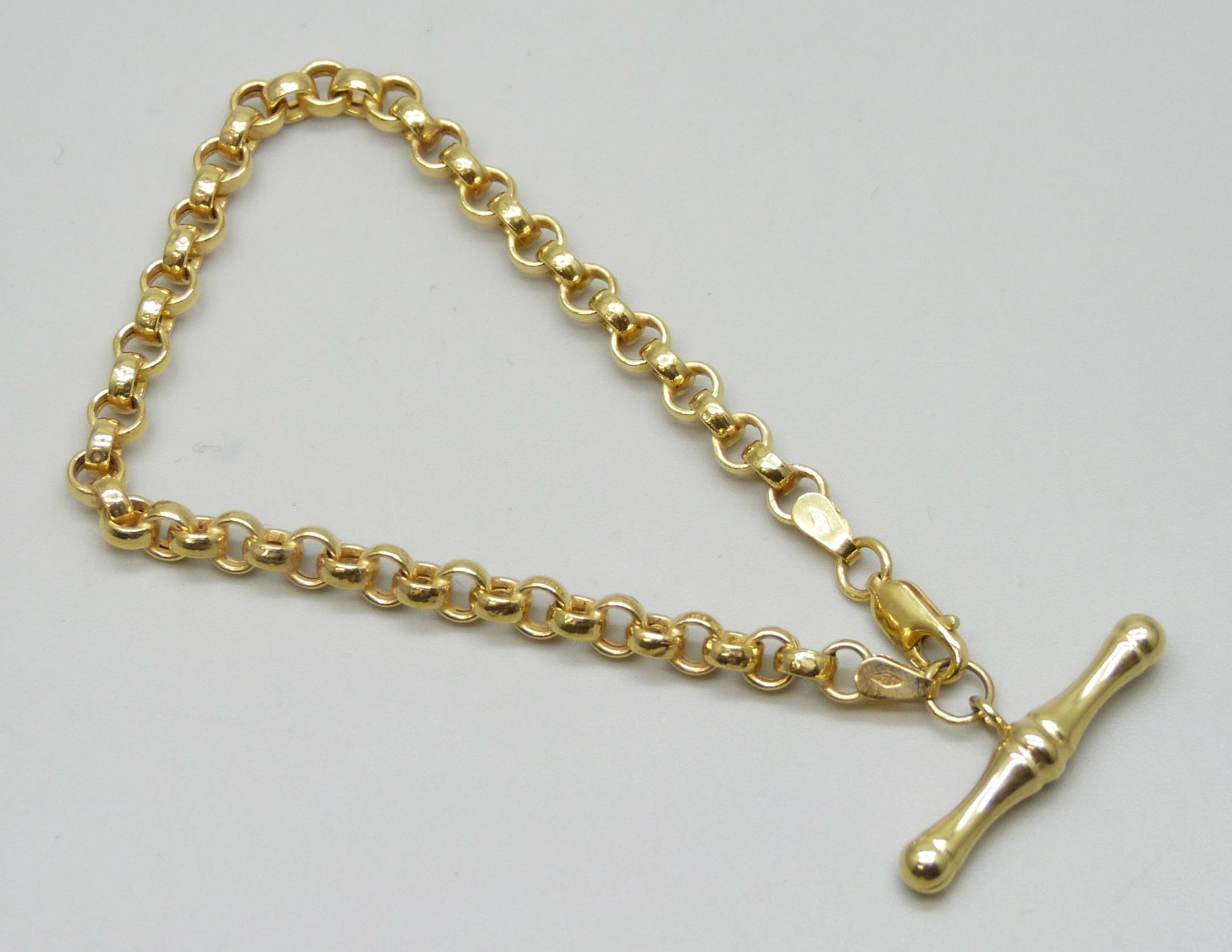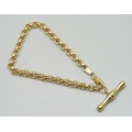 A 9ct gold Albert style belcher chain bracelet with T bar pendant, 3.6g, 4mm wide links, 17.5cm