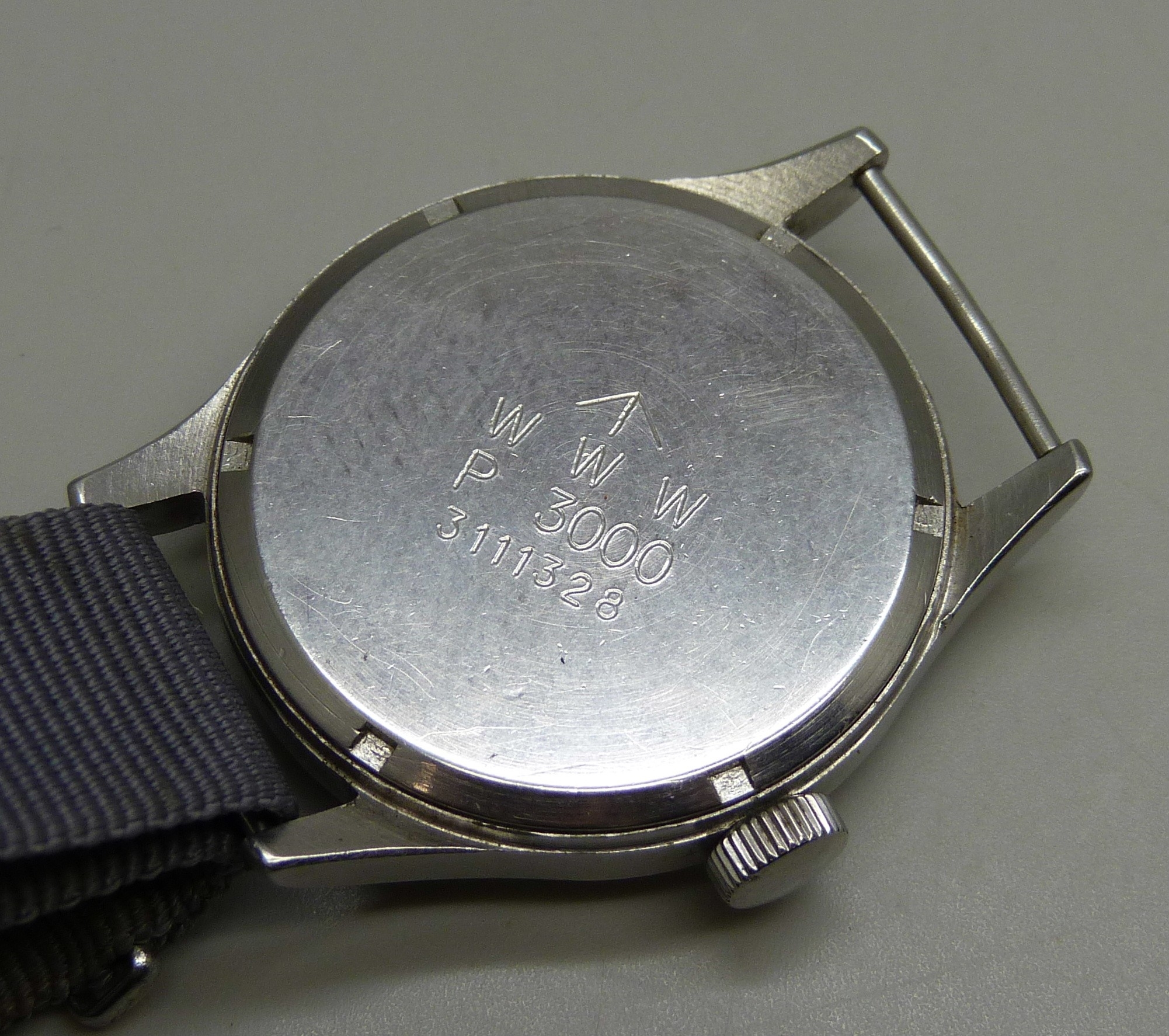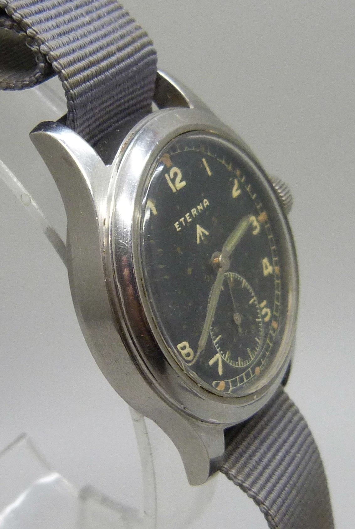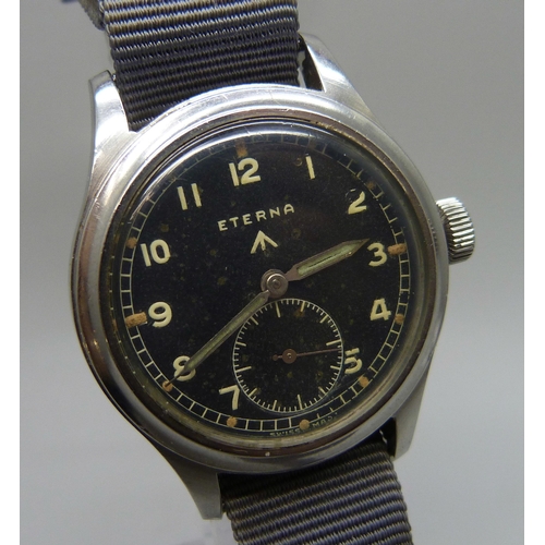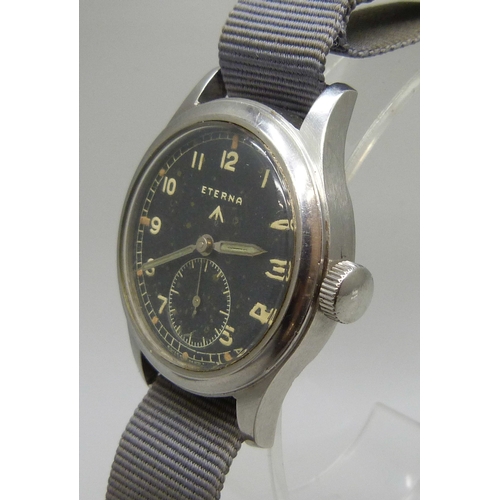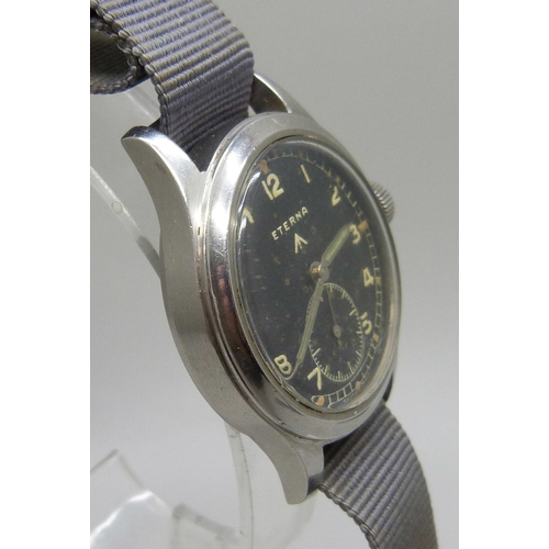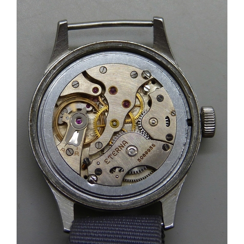 Eterna - a British military issue 'Dirty Dozen' wristwatch, stainless steel case, case back numbered P3000 3111328 W.W.W., manual wind movement, black luminous dial, on a grey Nato style strap