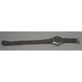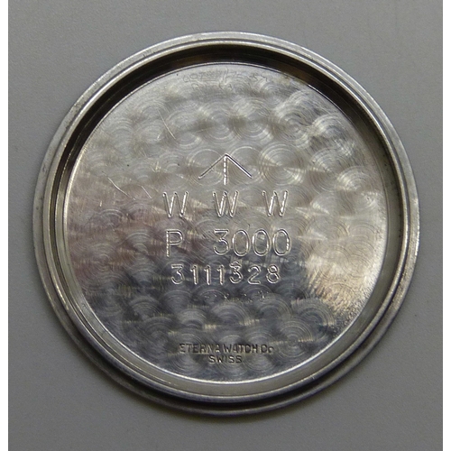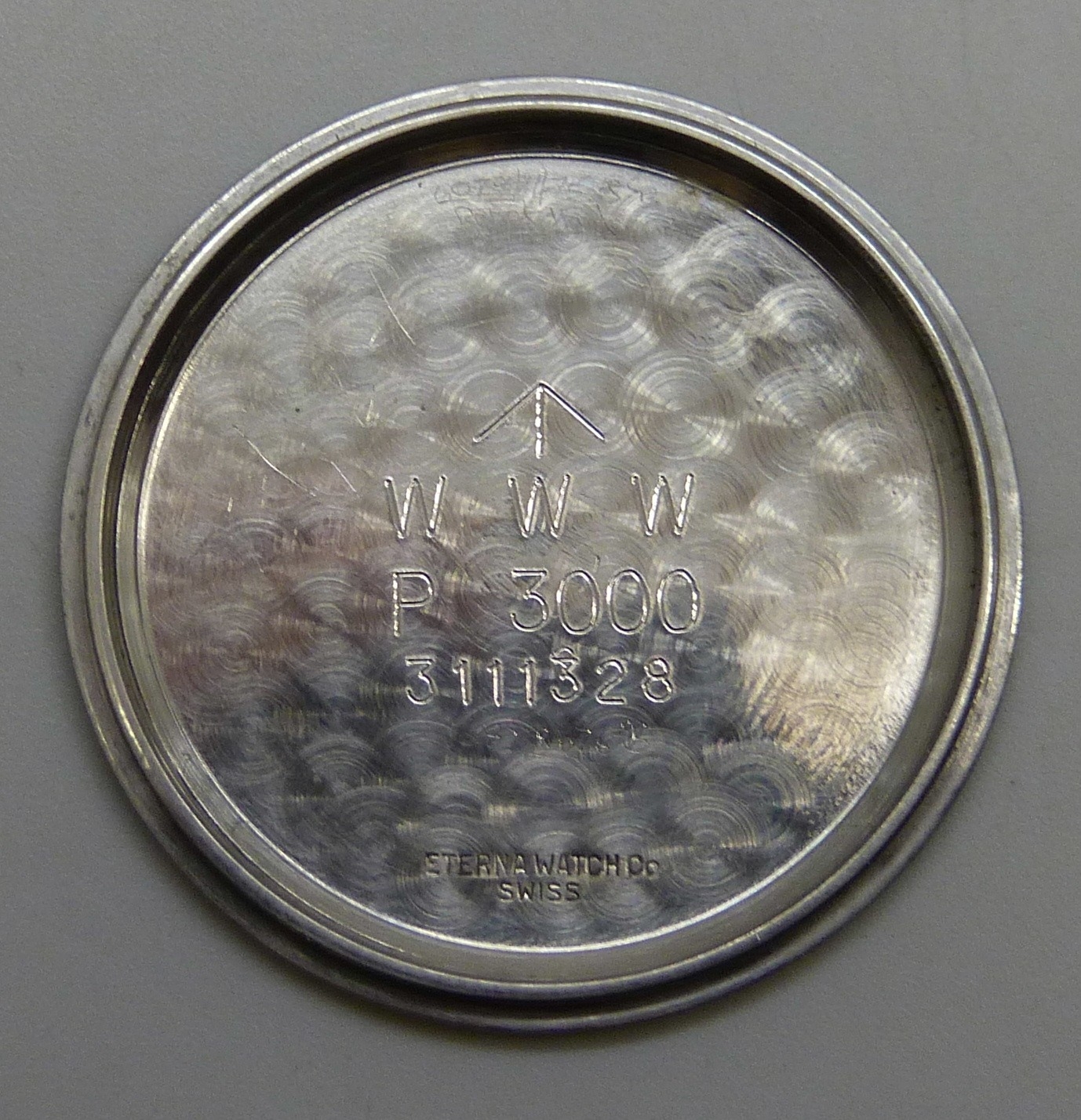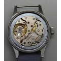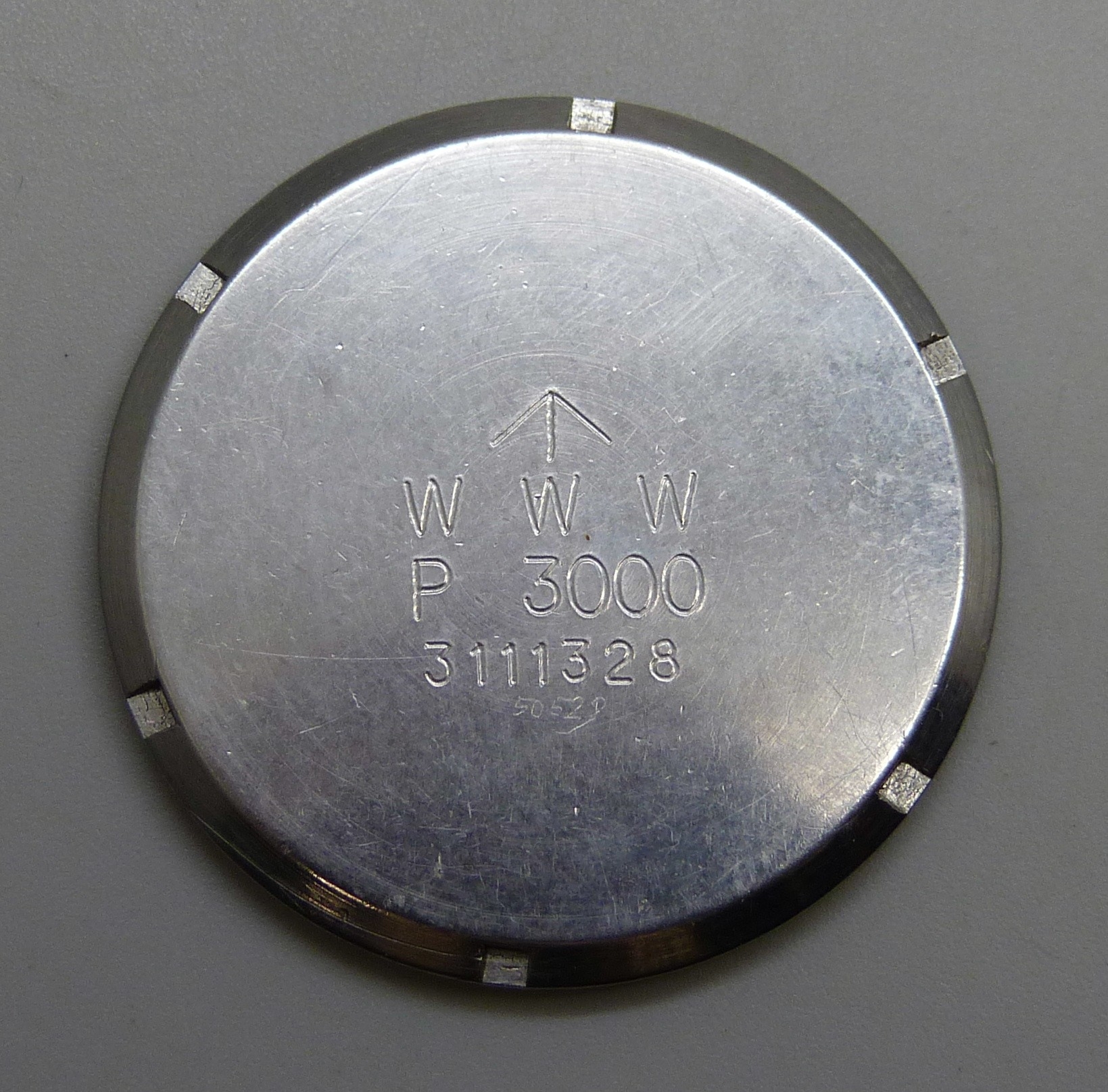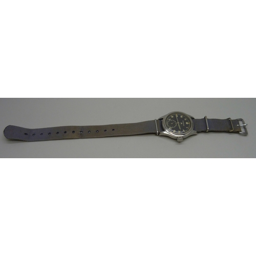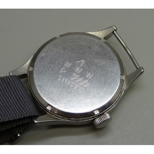 Eterna - a British military issue 'Dirty Dozen' wristwatch, stainless steel case, case back numbered P3000 3111328 W.W.W., manual wind movement, black luminous dial, on a grey Nato style strap