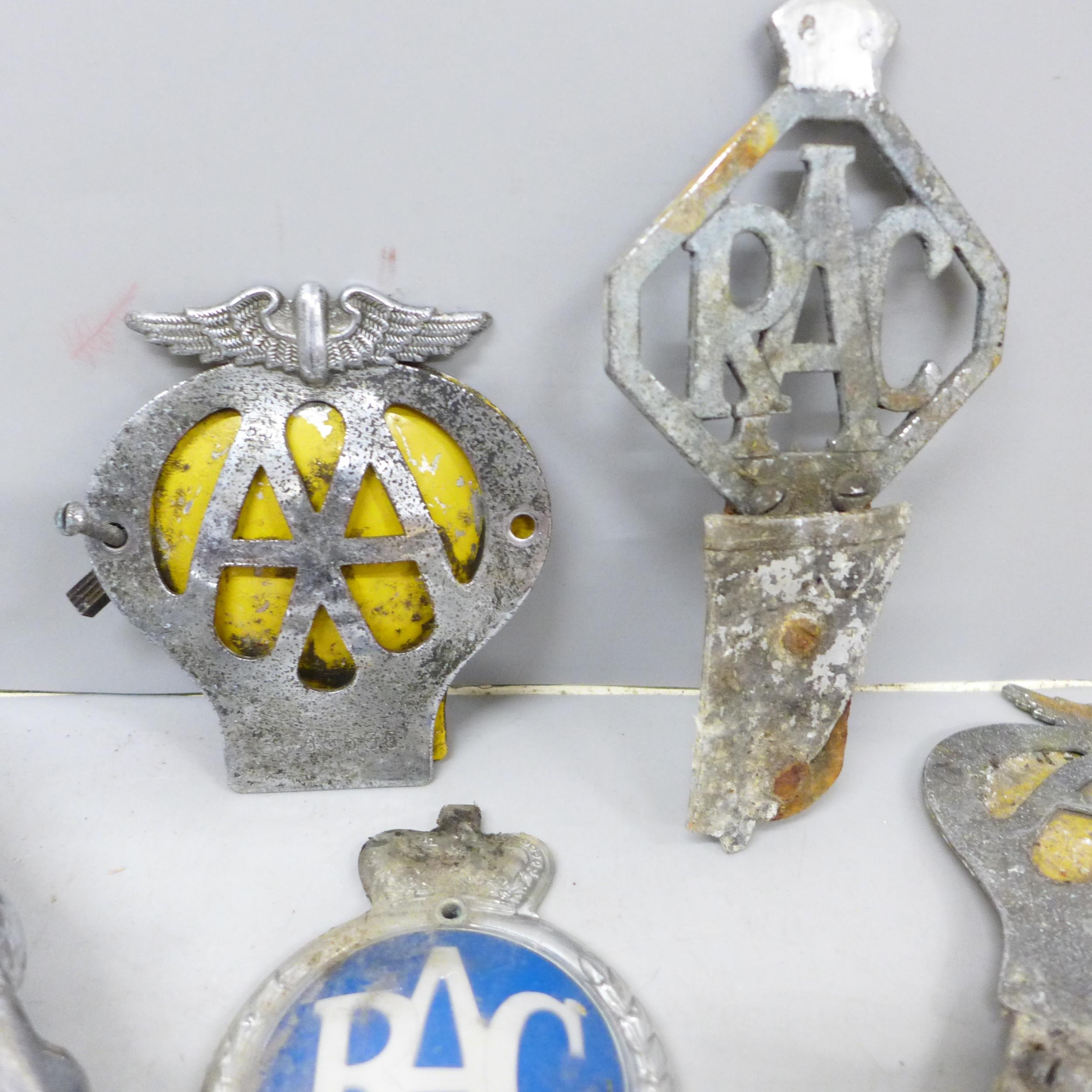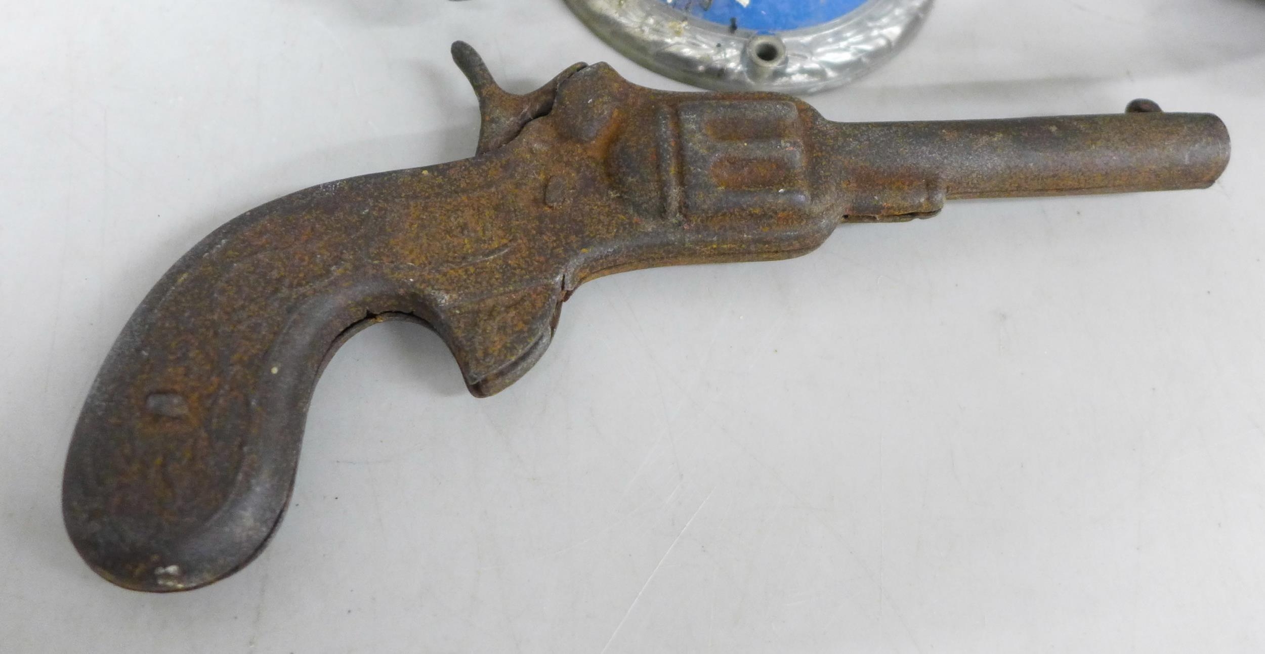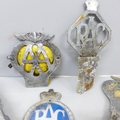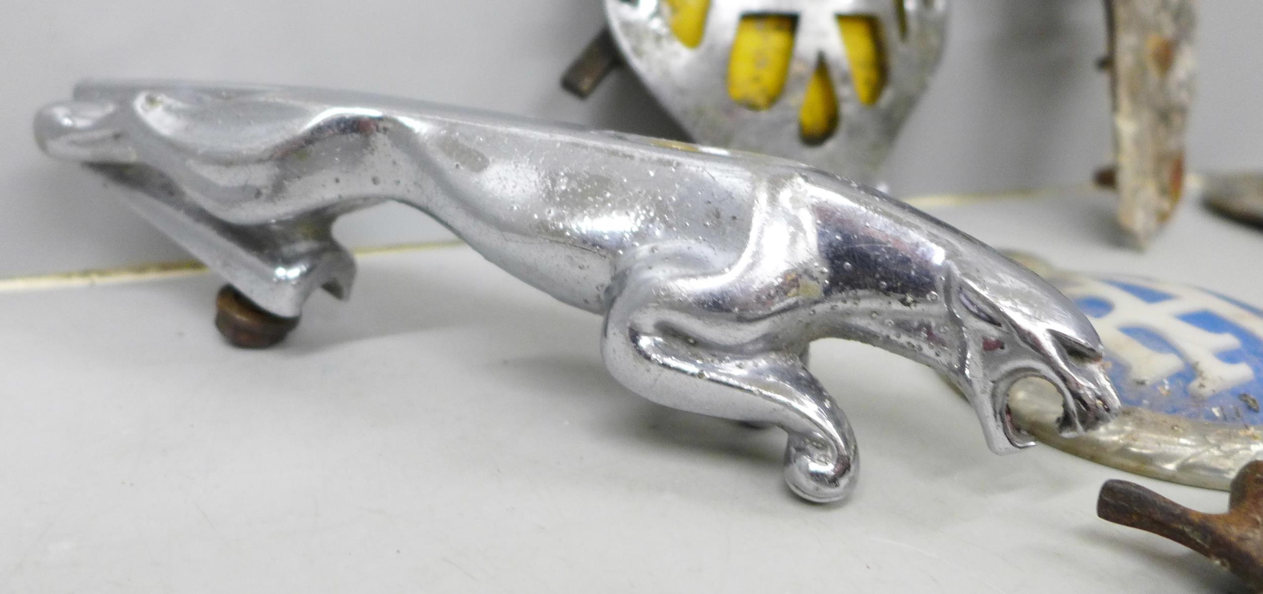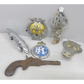 A Jaguar car mascot, two AA and RAC badges and a toy gun