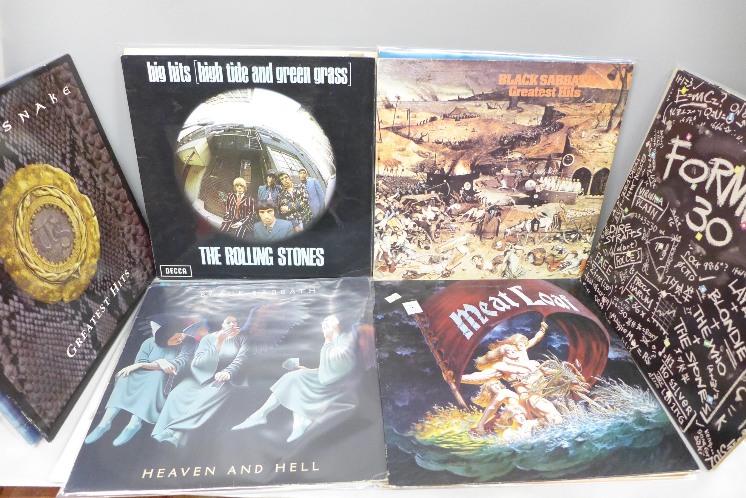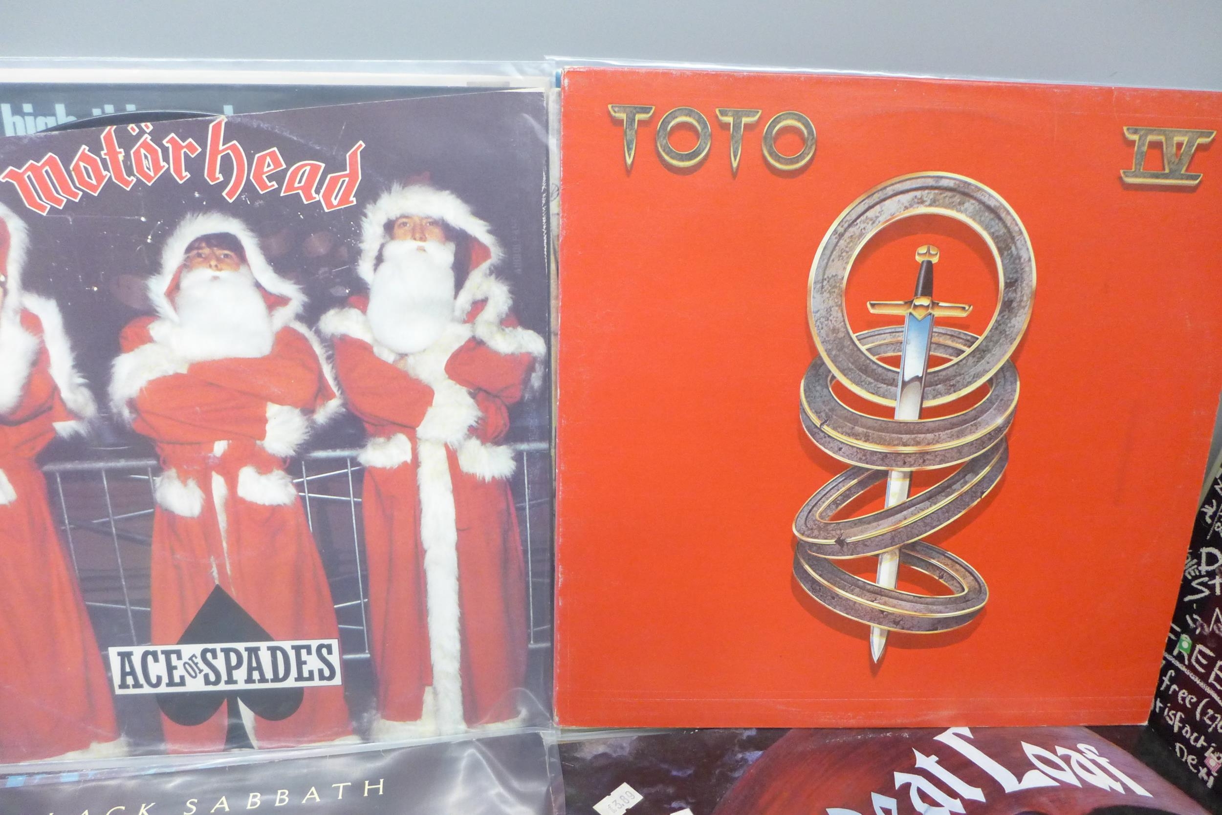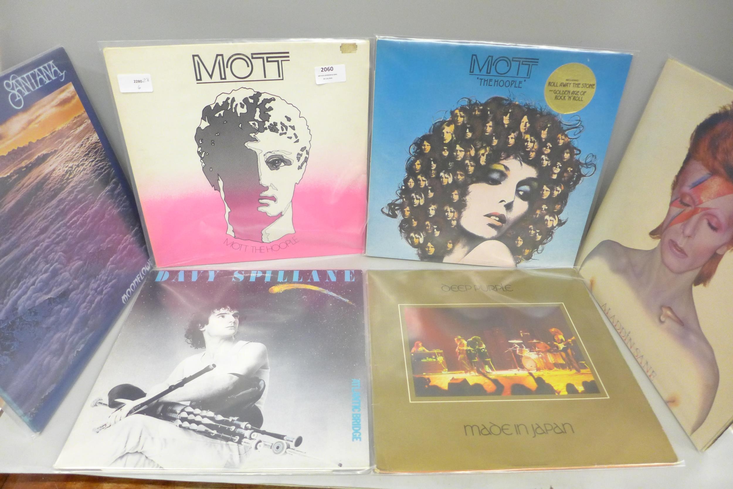 Thirteen Rock LP records and a 12" single including David Bowie, Mott the Hoople, Deep Purple, Santana, Black Sabbath, Whitesnake, etc.