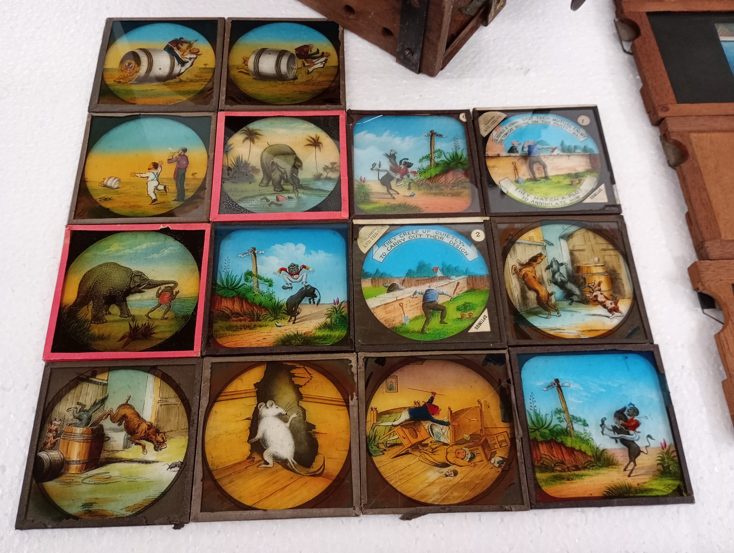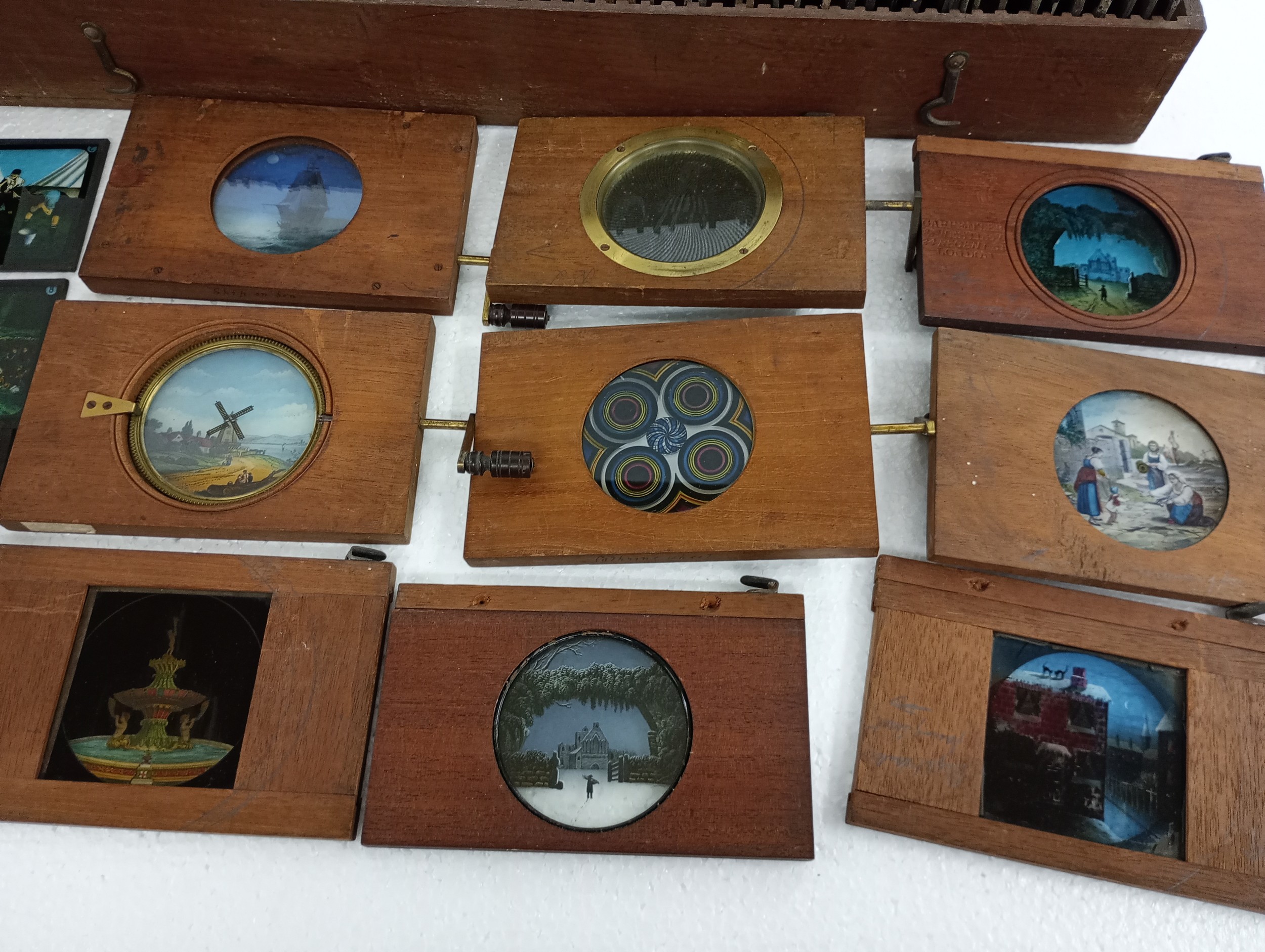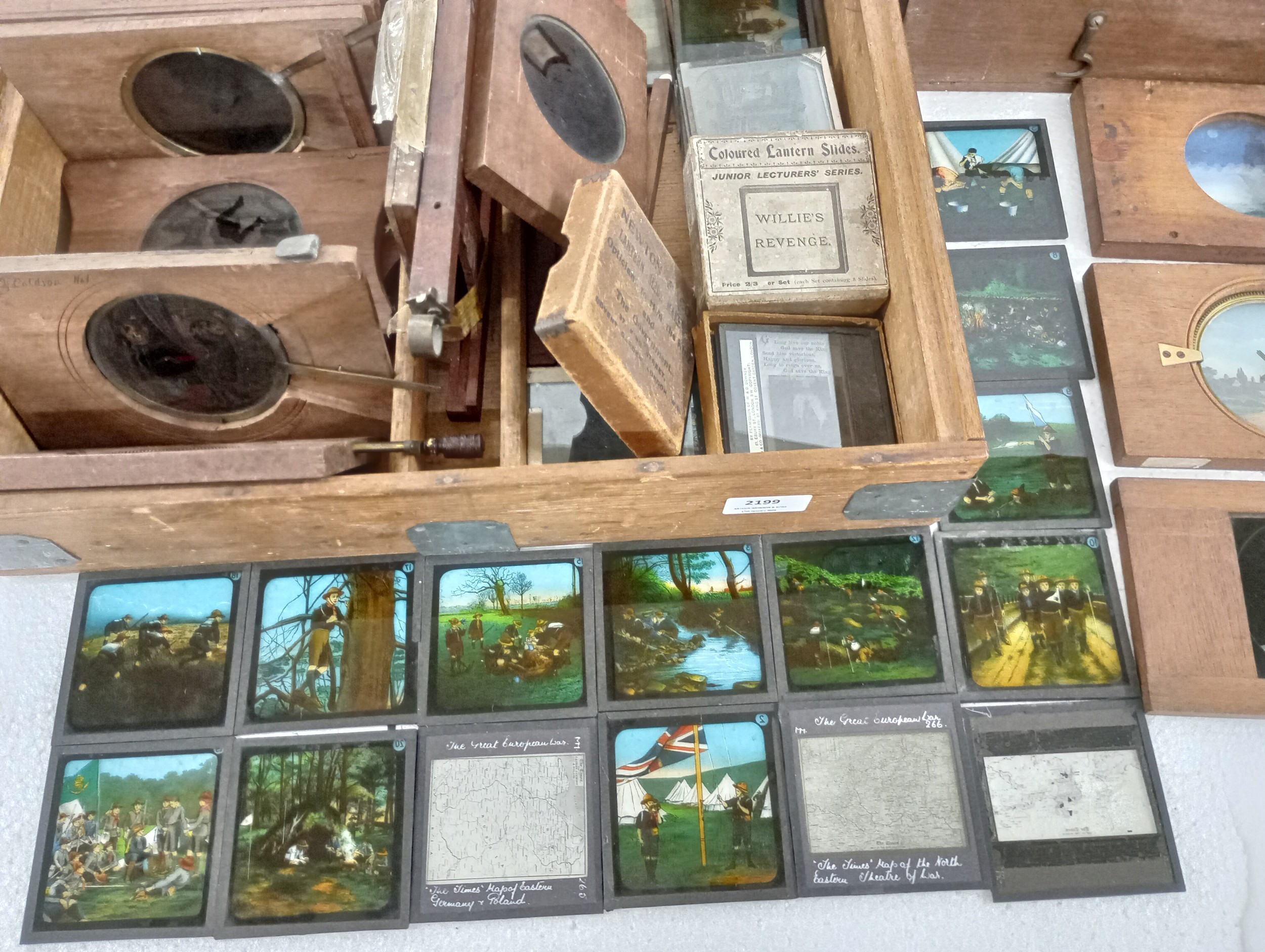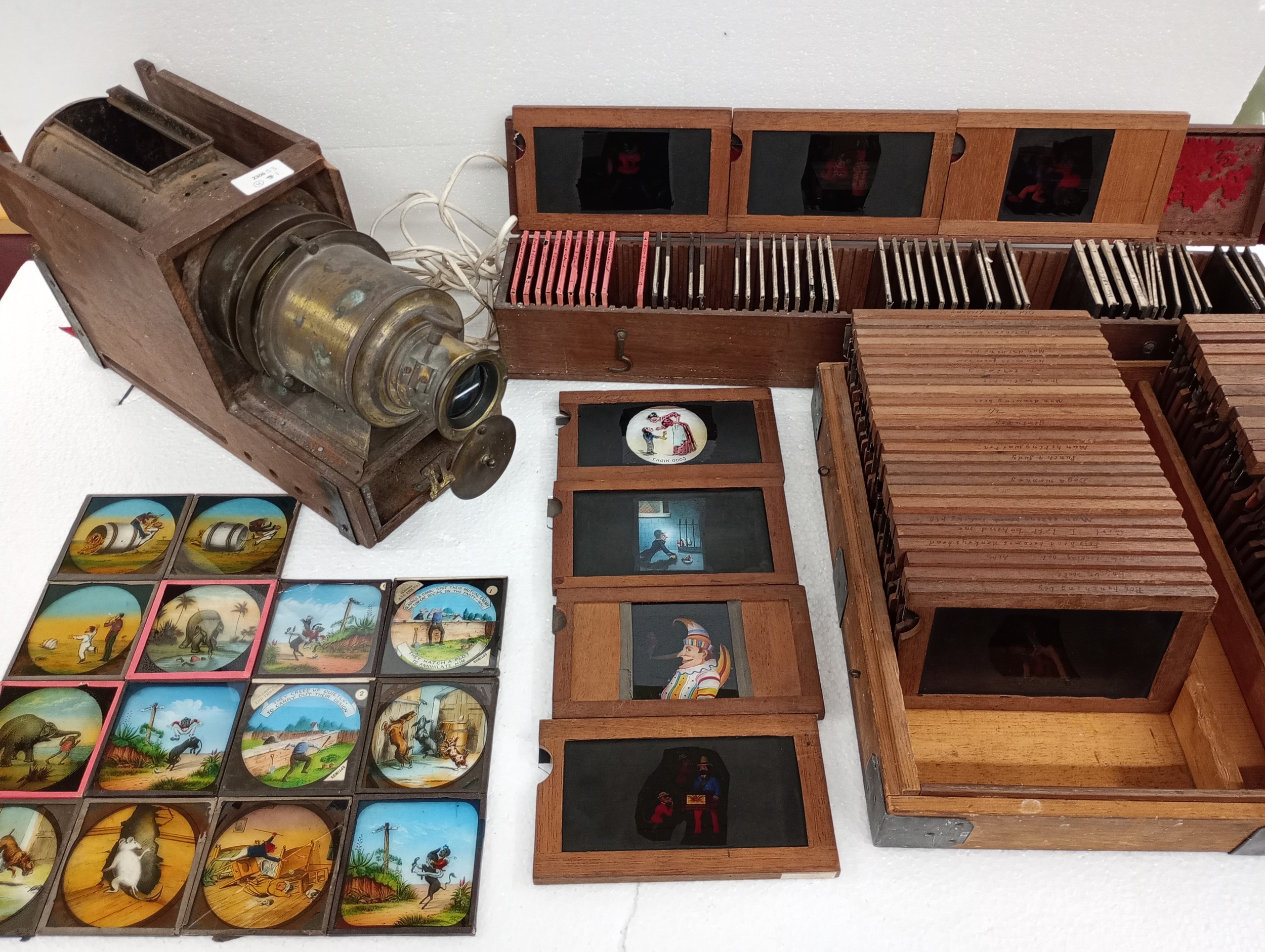 A large 19th Century wooden and brass magic lantern with three boxes of slides including humour, maps, landscapes, Scouts activities, etc.
