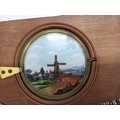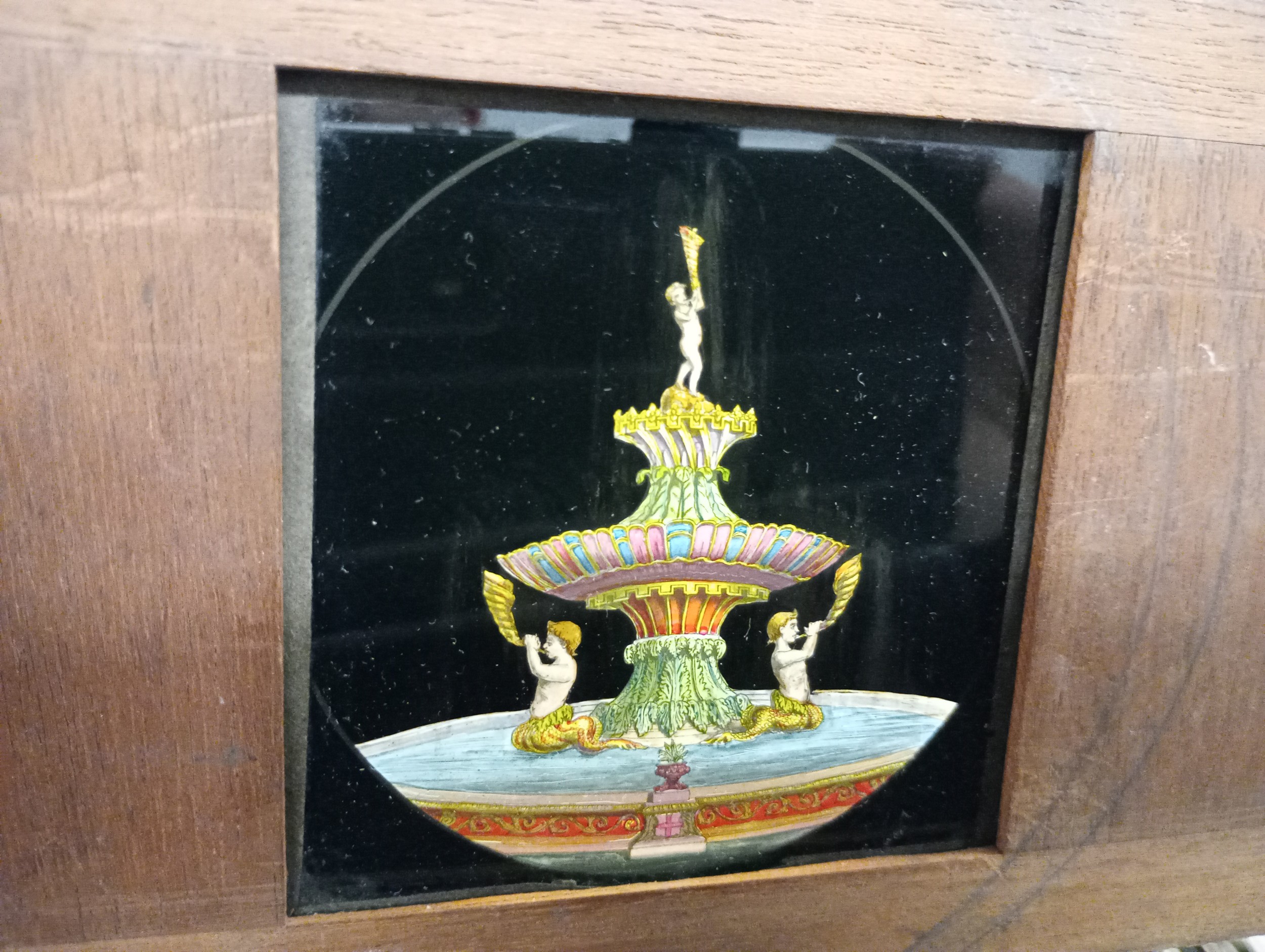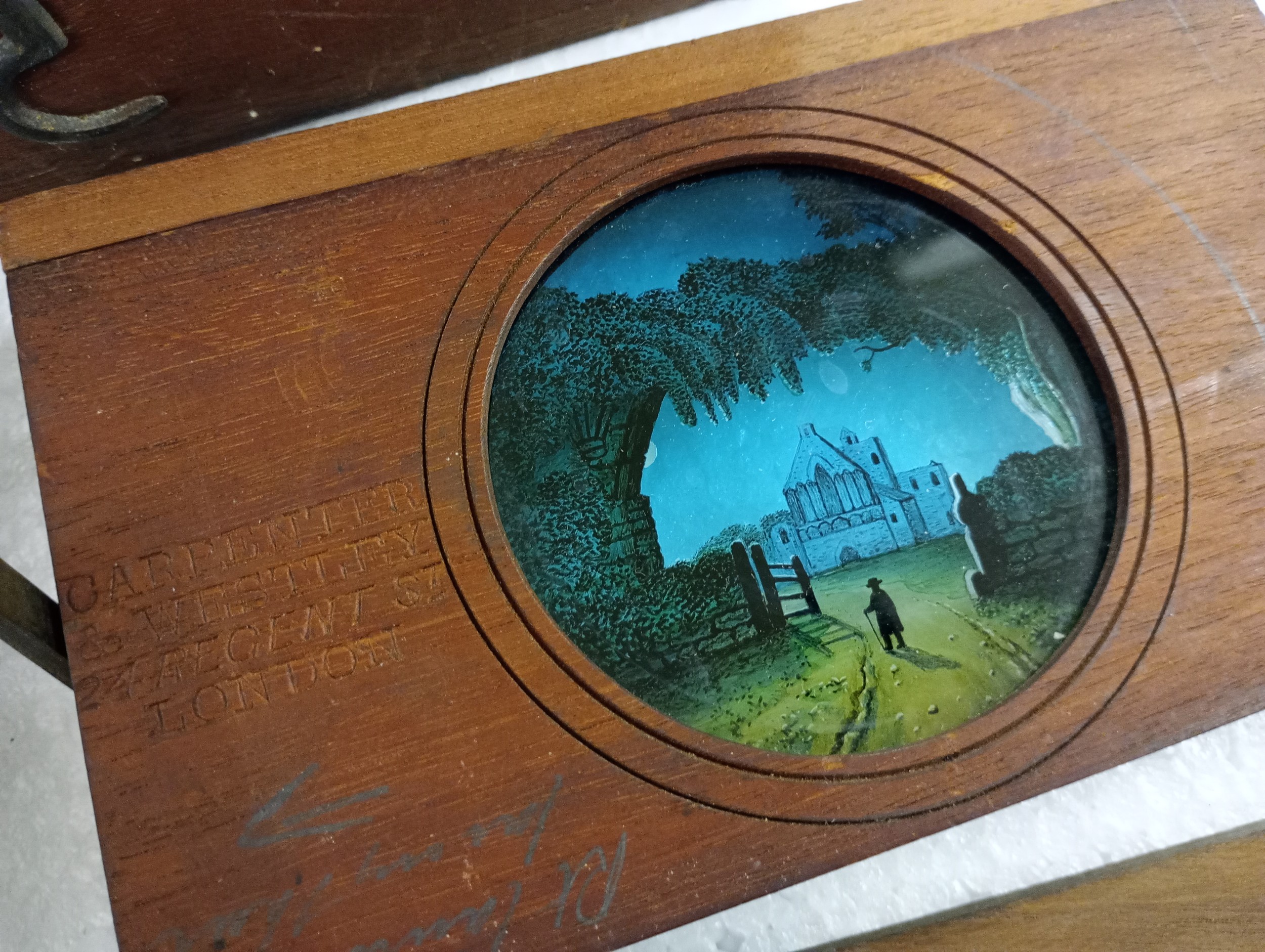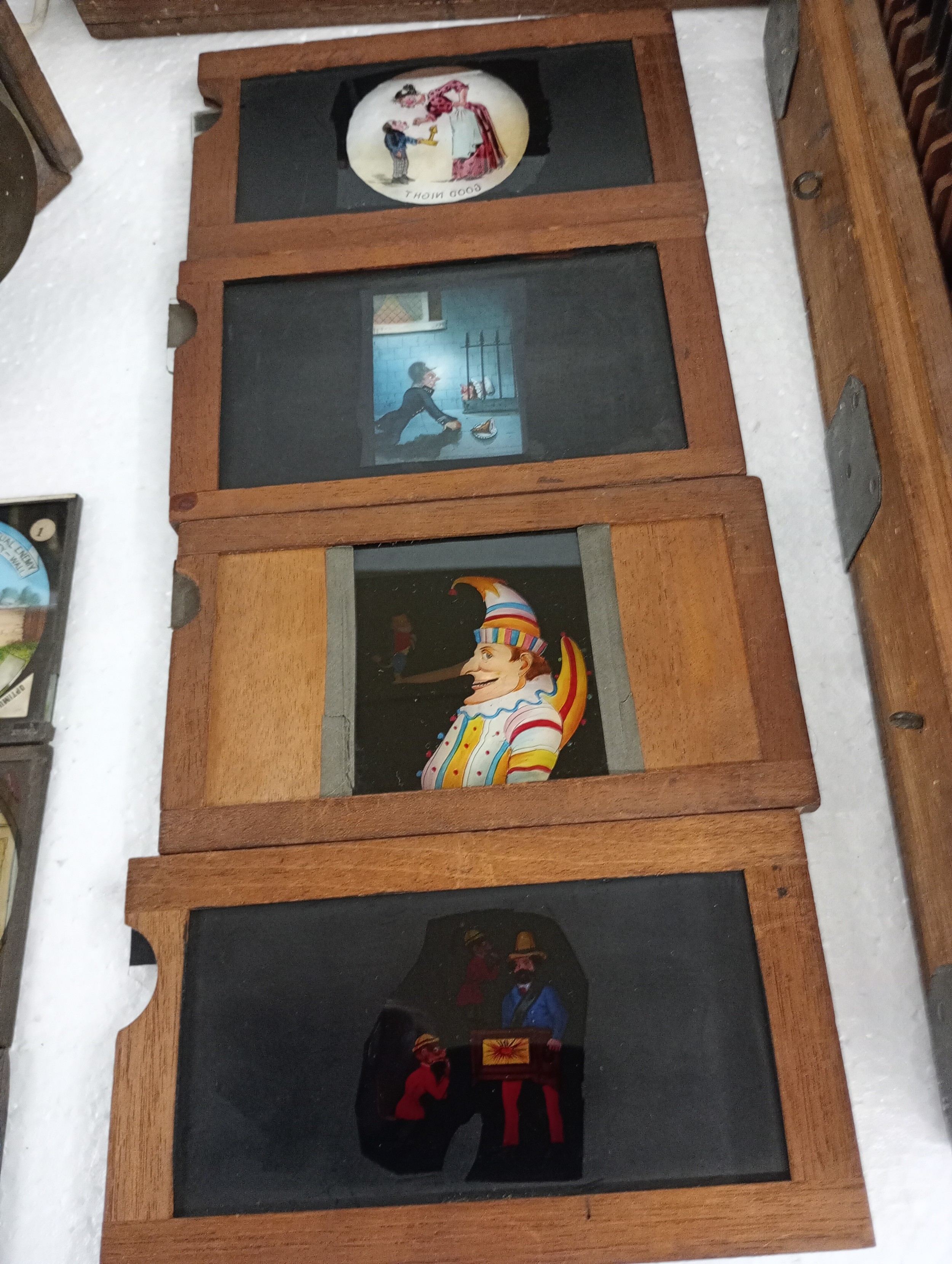 A large 19th Century wooden and brass magic lantern with three boxes of slides including humour, maps, landscapes, Scouts activities, etc.