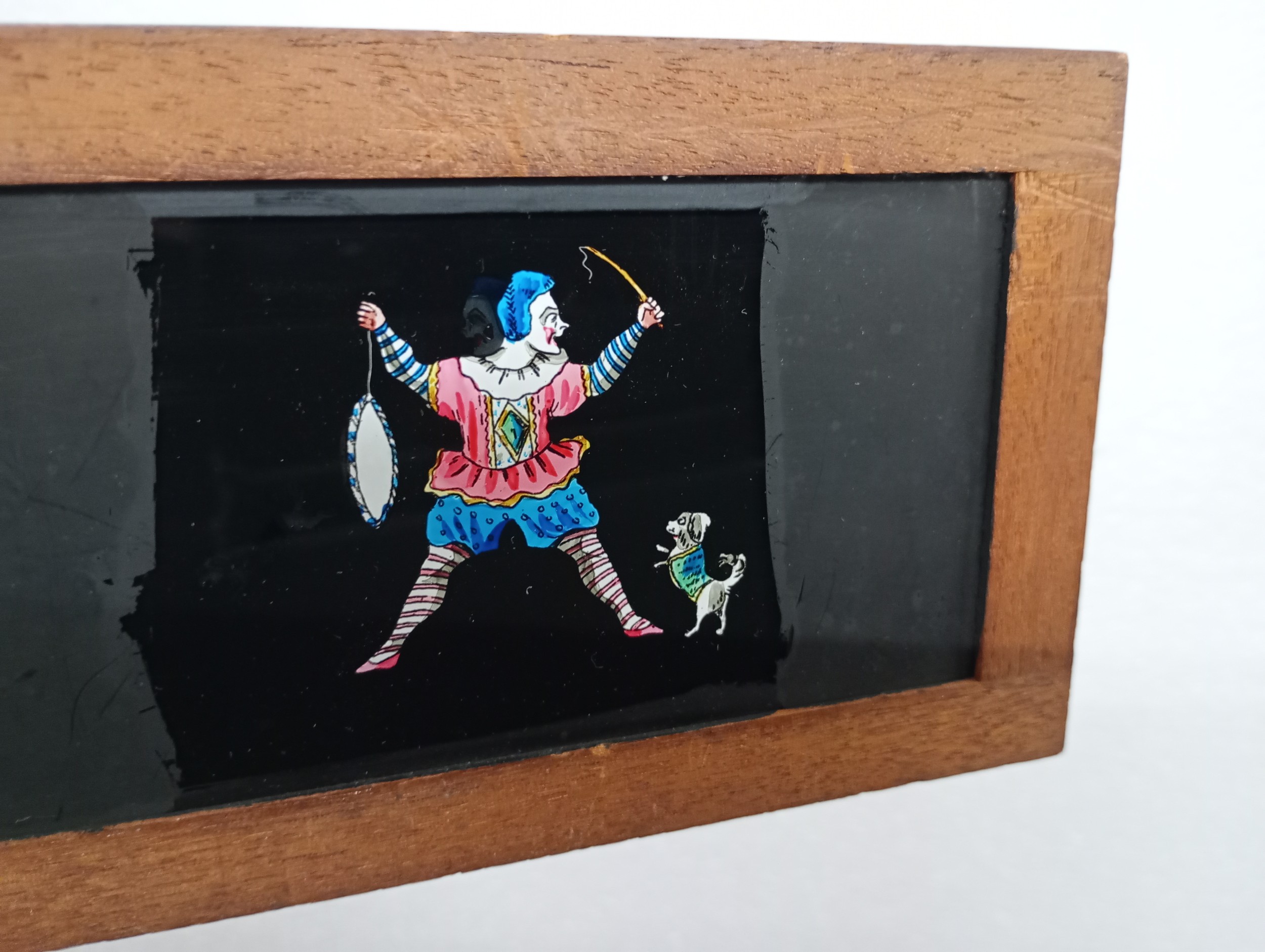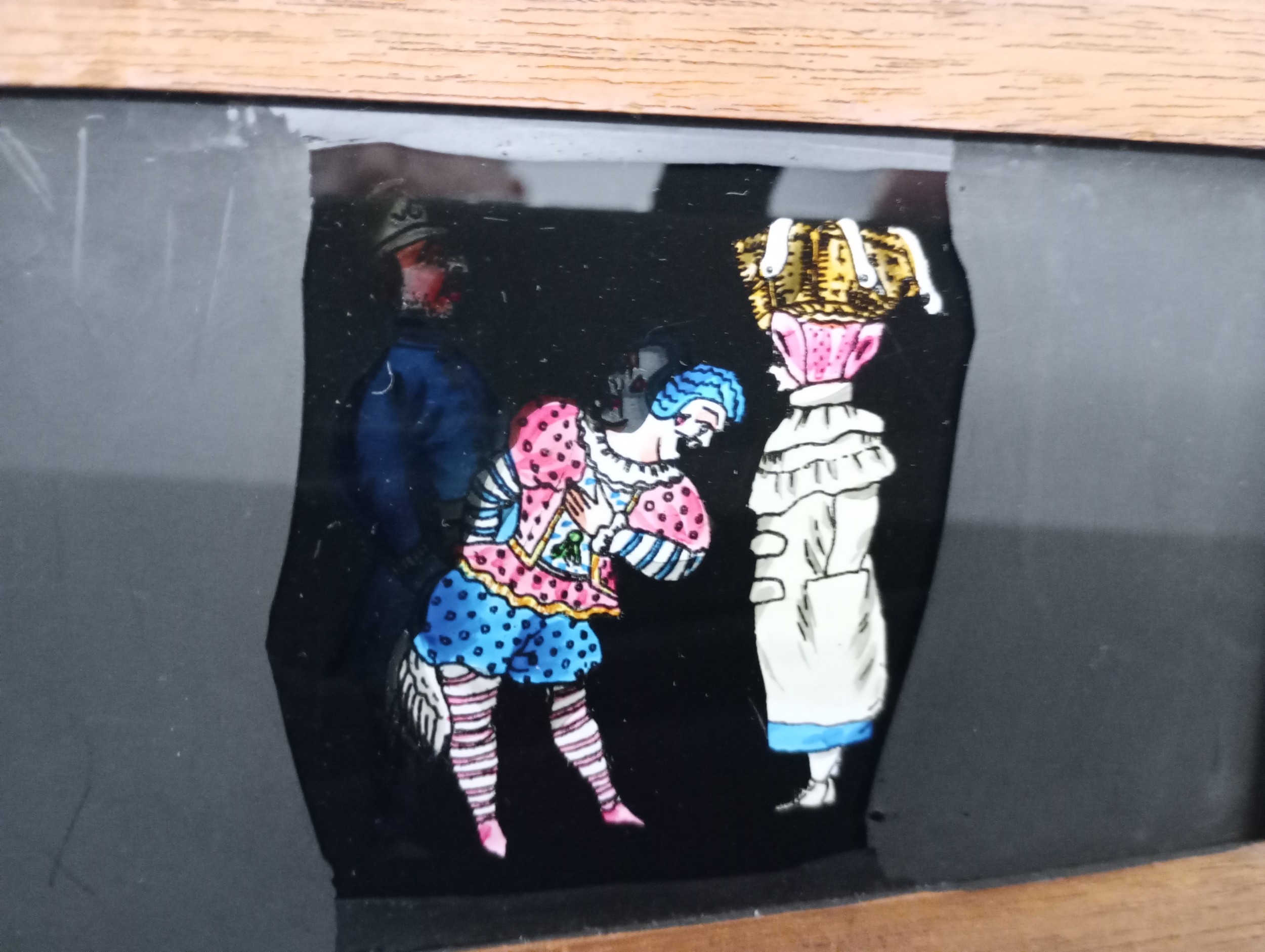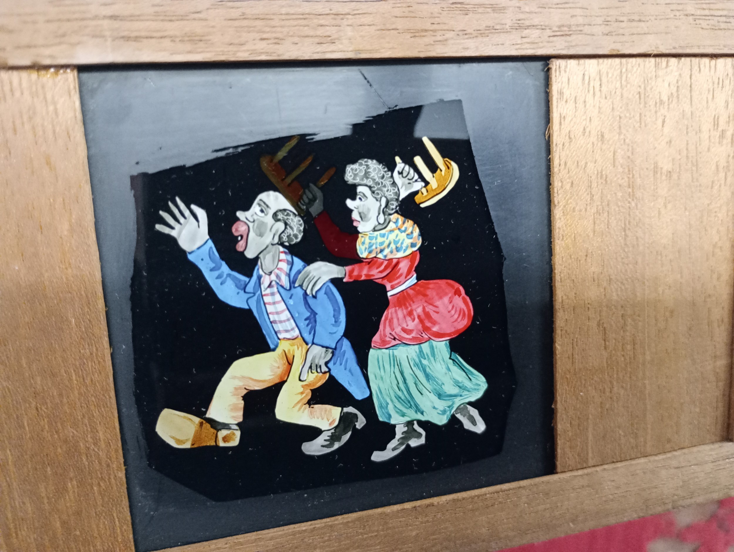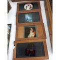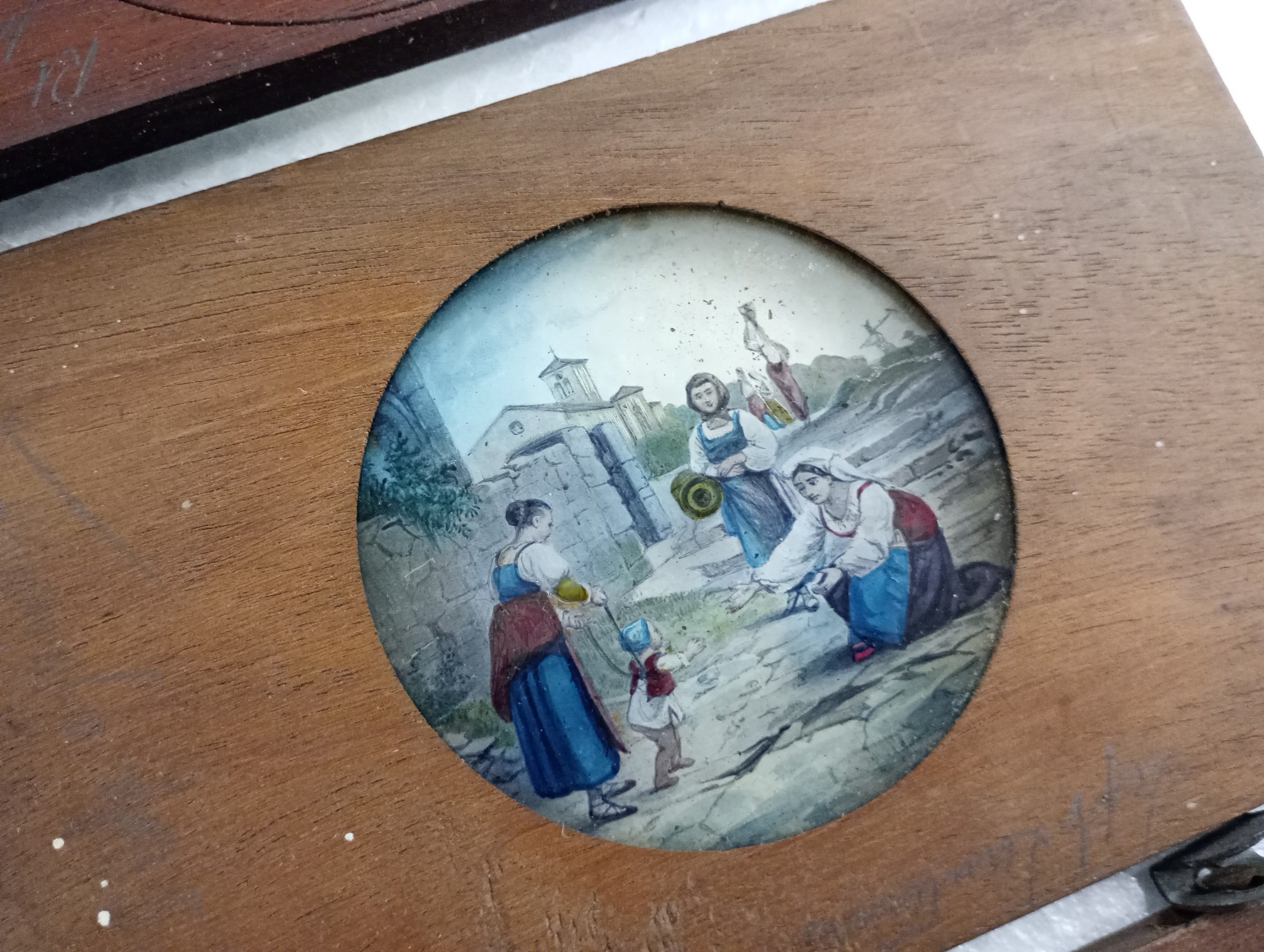 A large 19th Century wooden and brass magic lantern with three boxes of slides including humour, maps, landscapes, Scouts activities, etc.