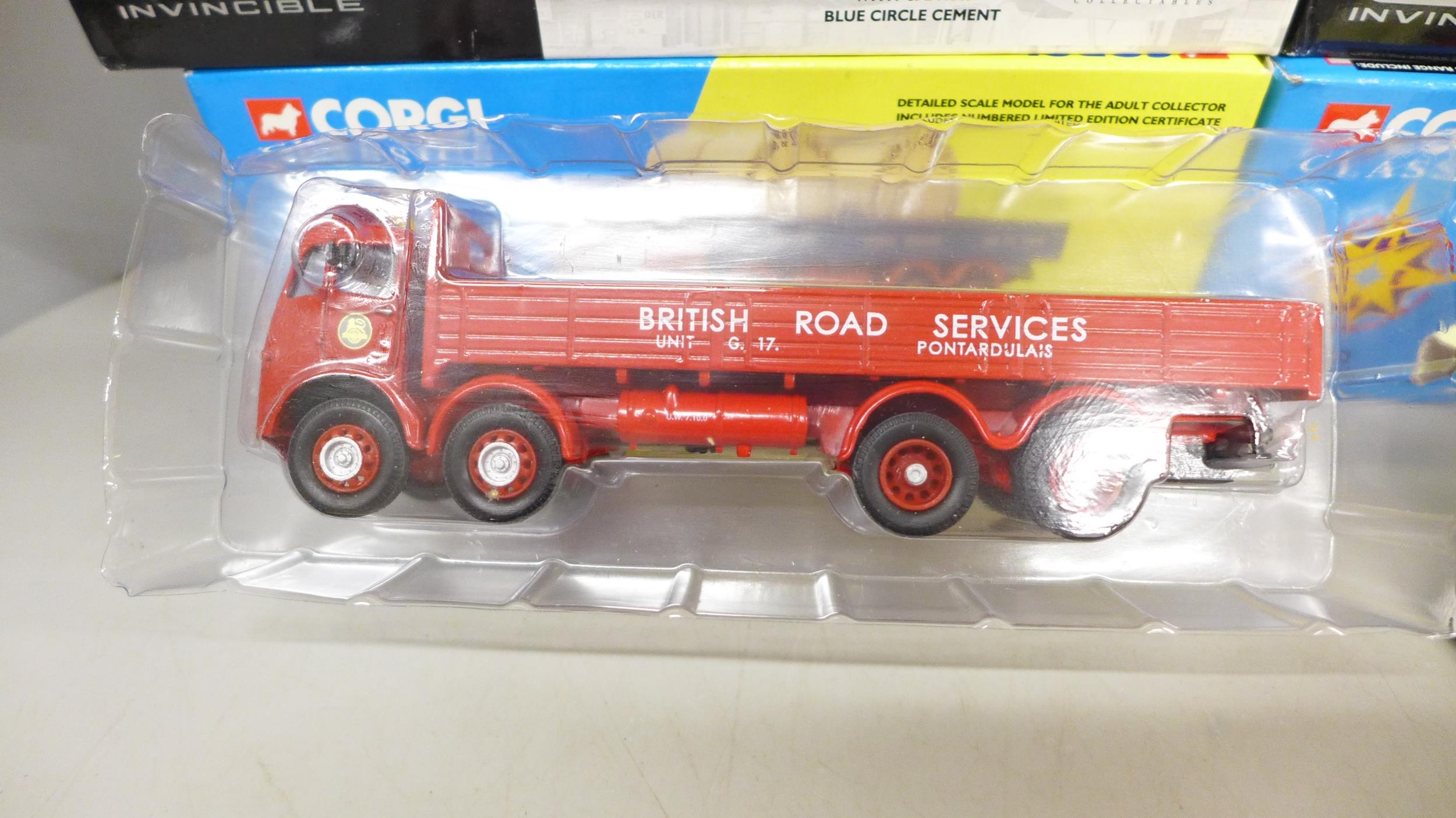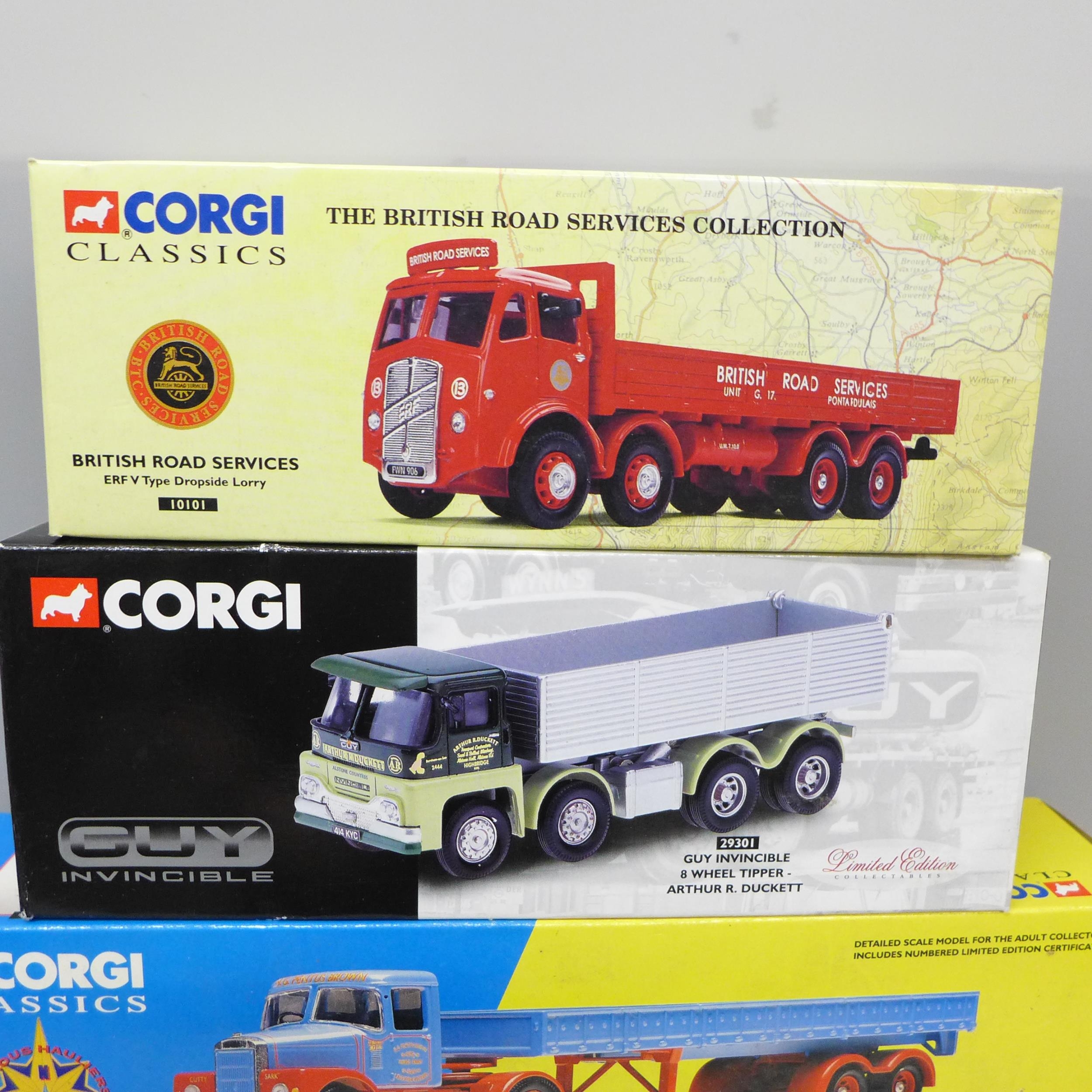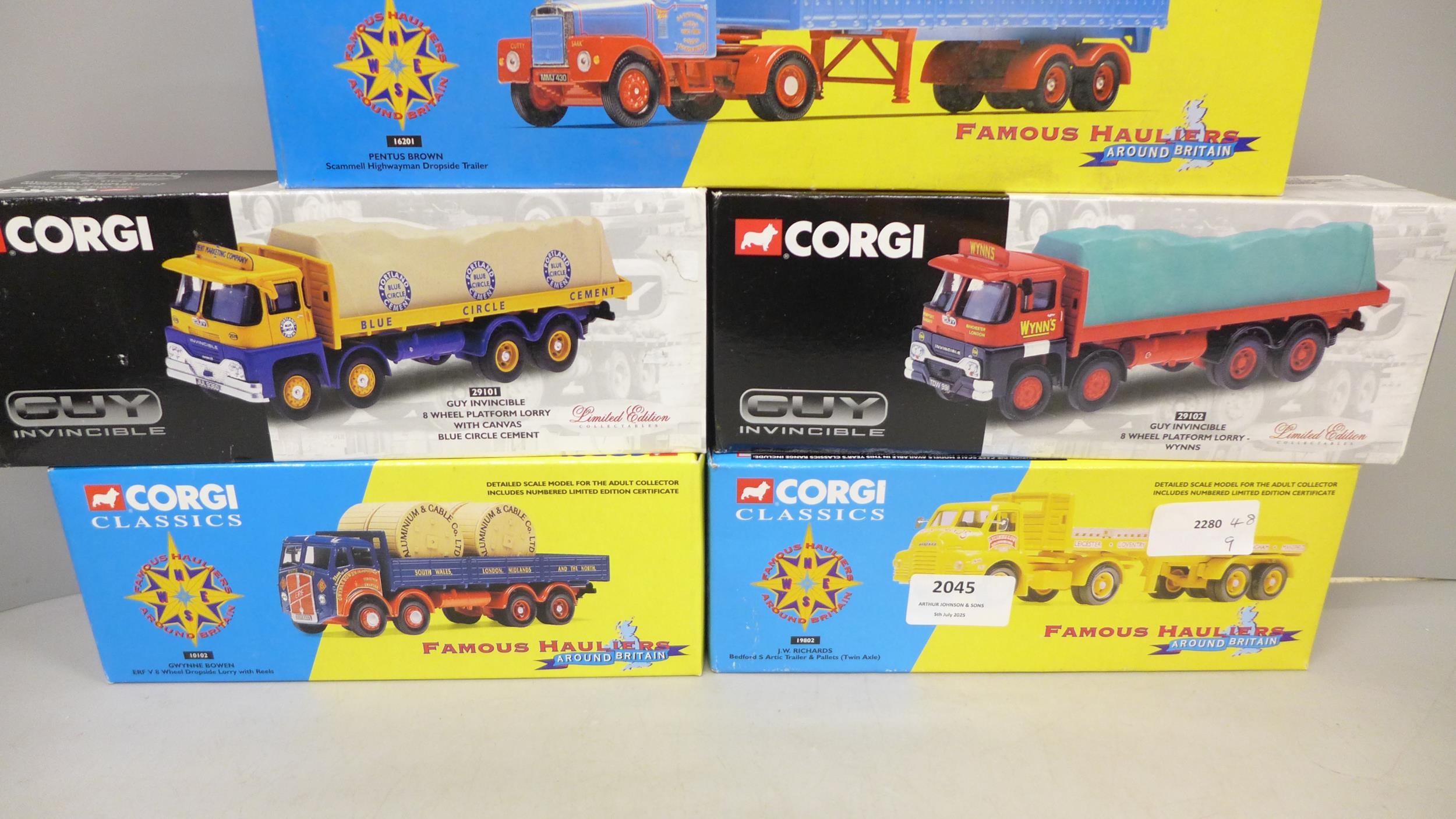 Seven Corgi models vehicles, including three Famous Hauliers and three Guy Invincible, boxed