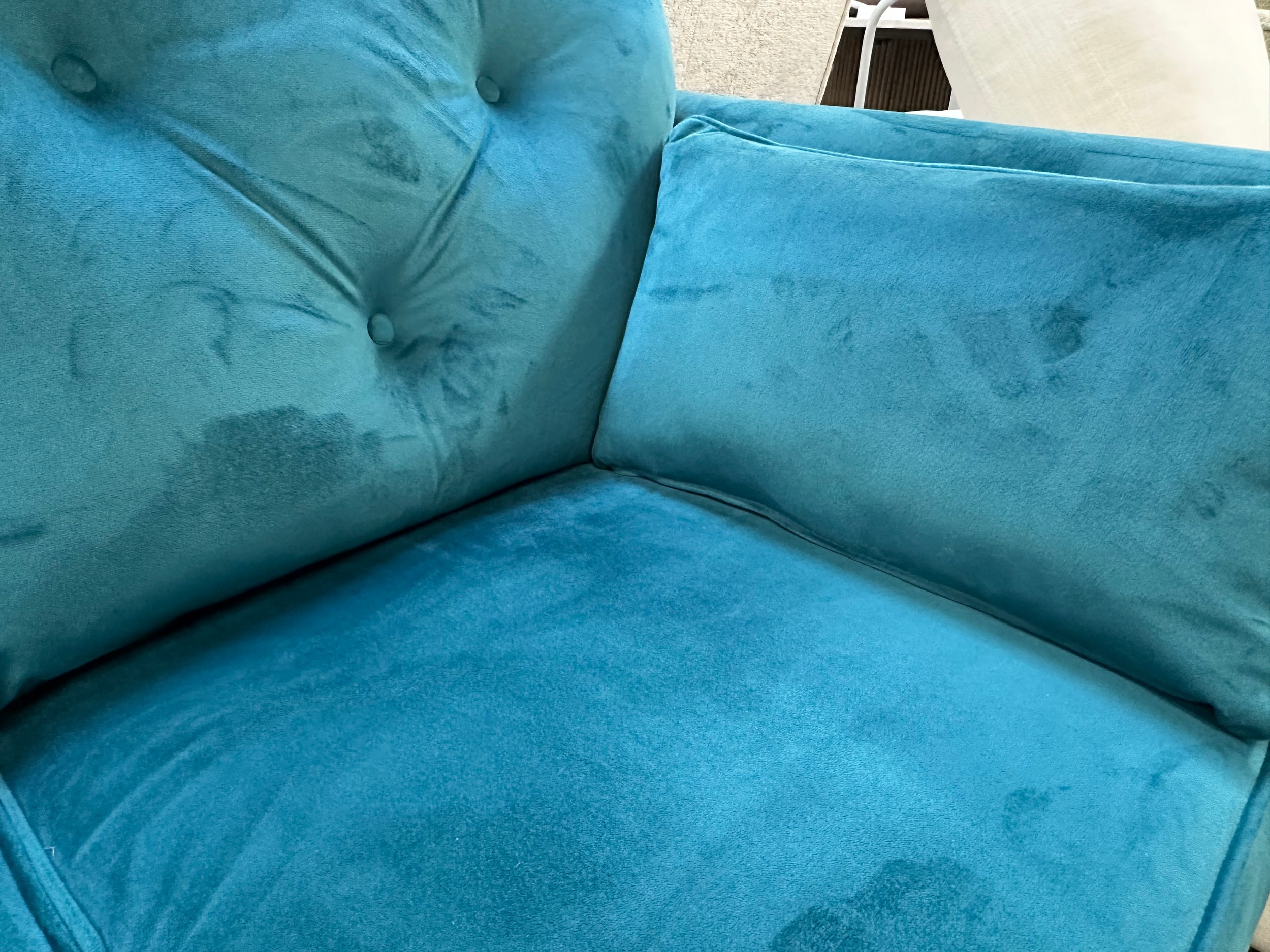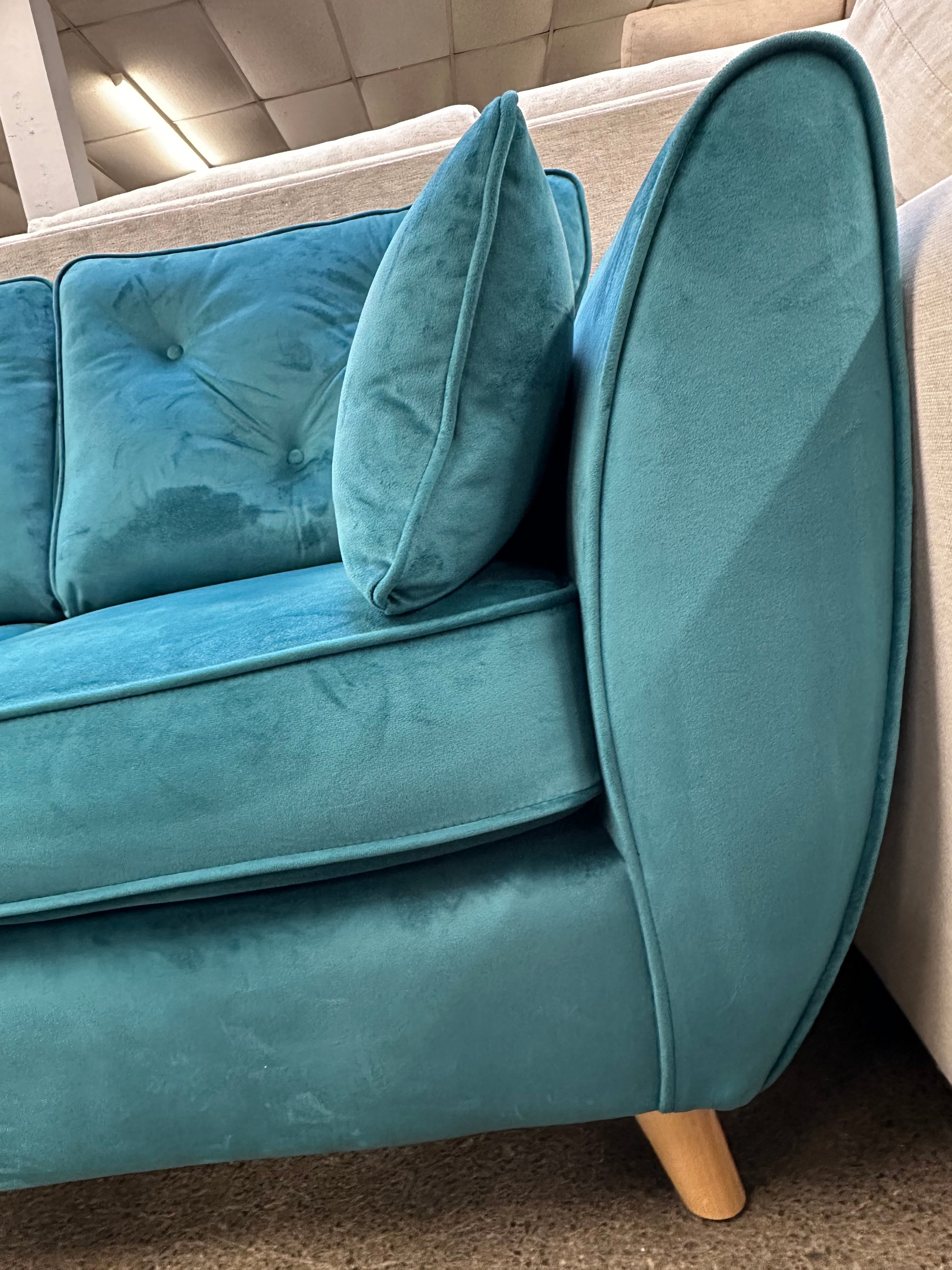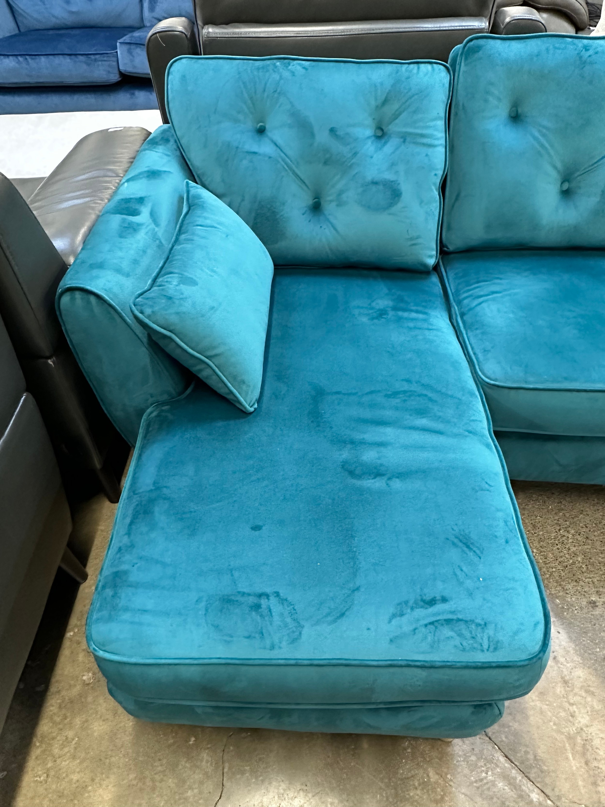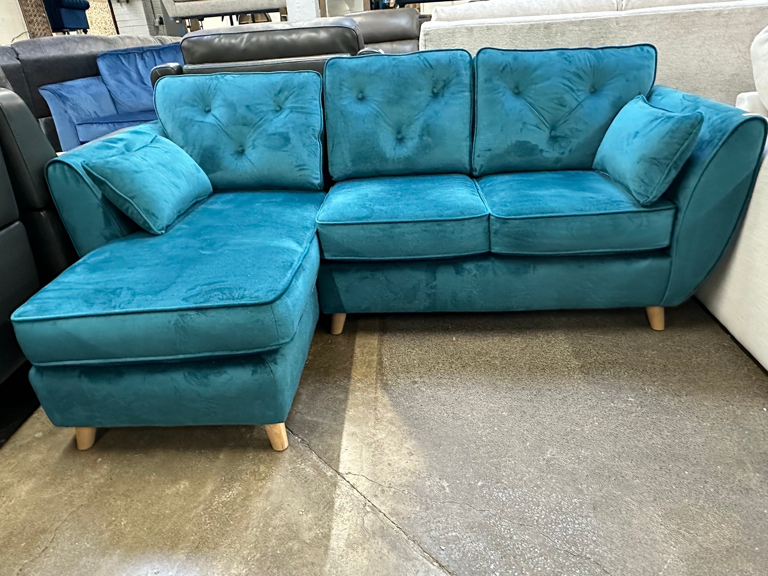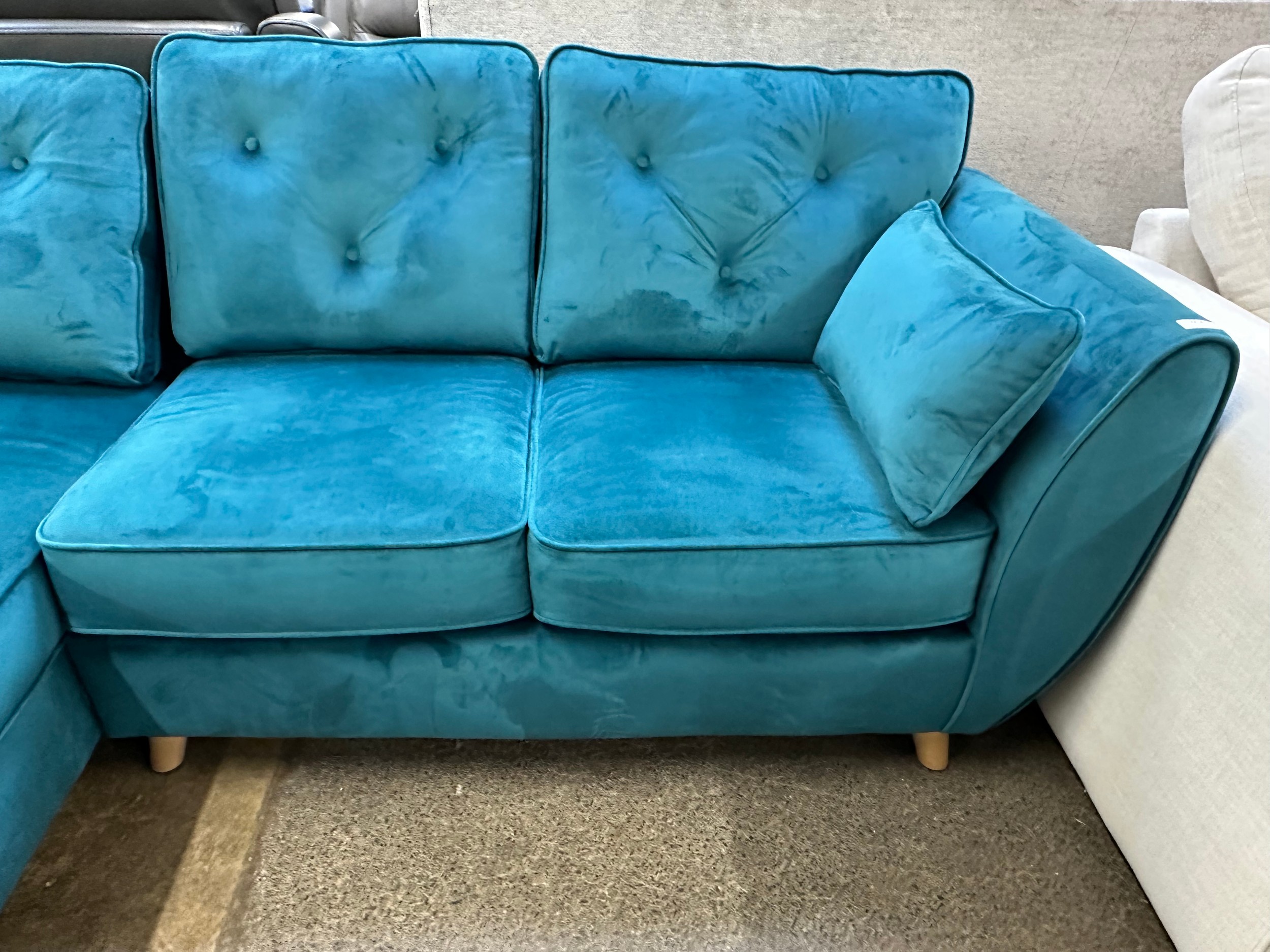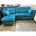 A turquoise velvet corner chaise sofa