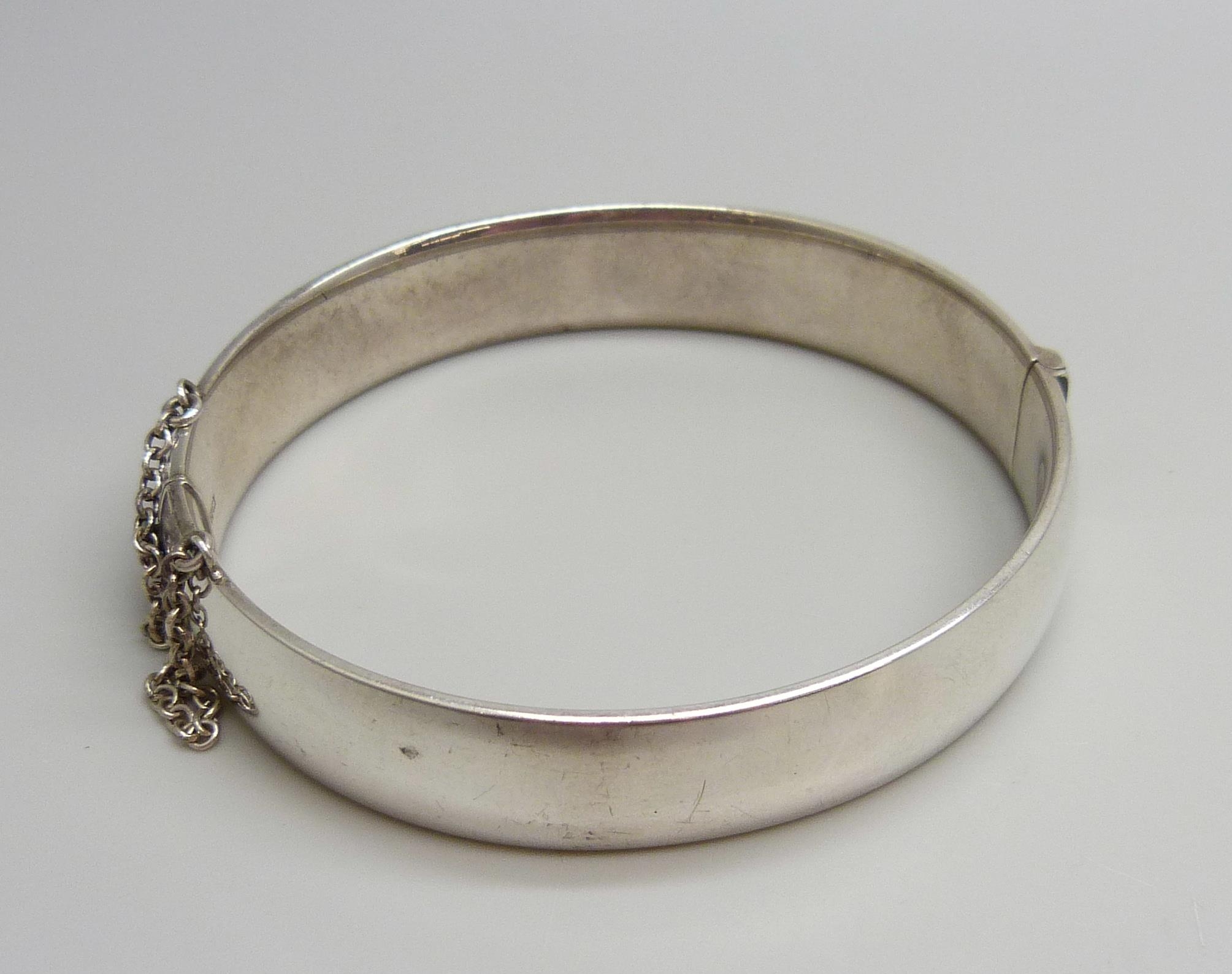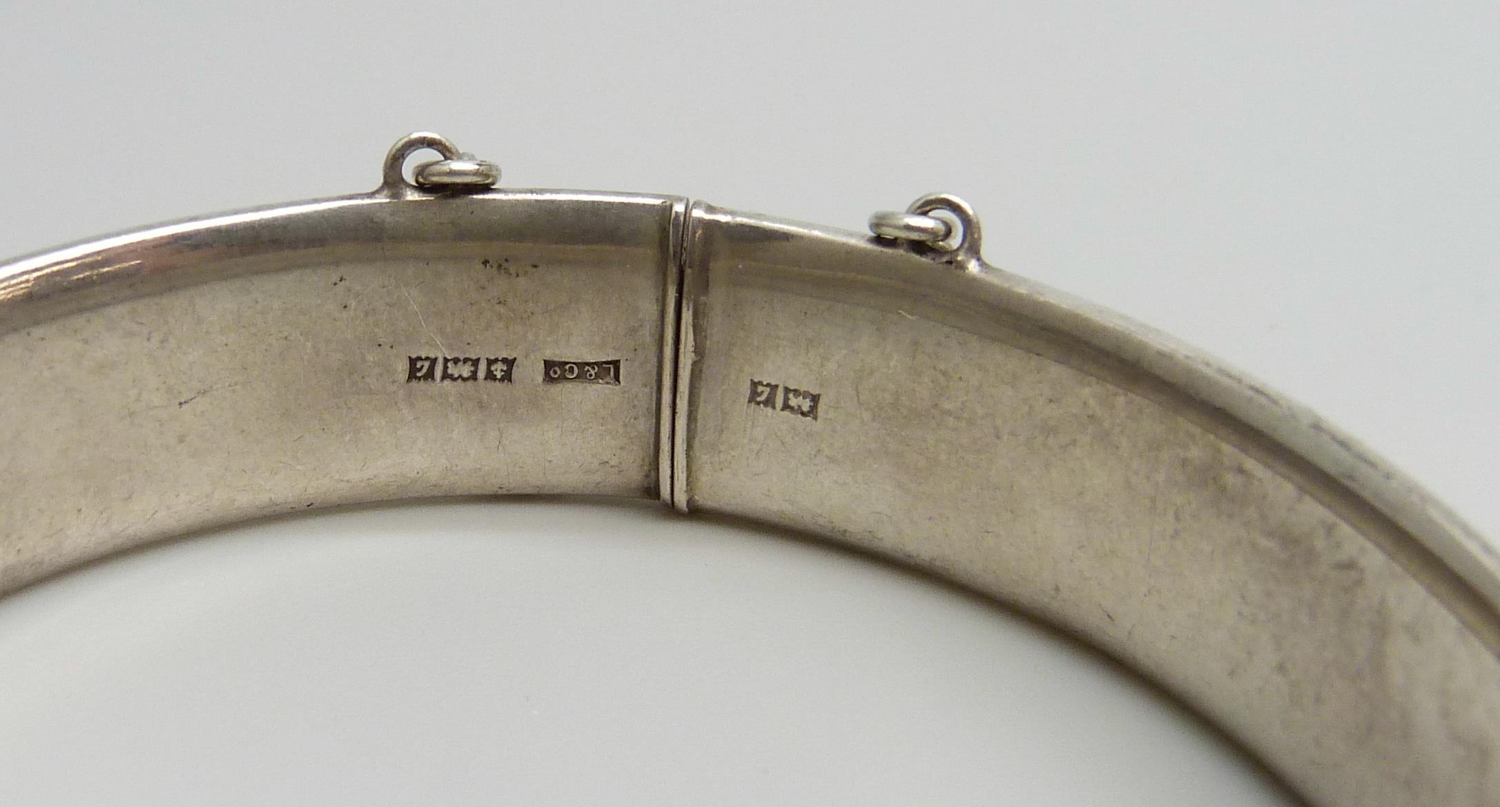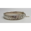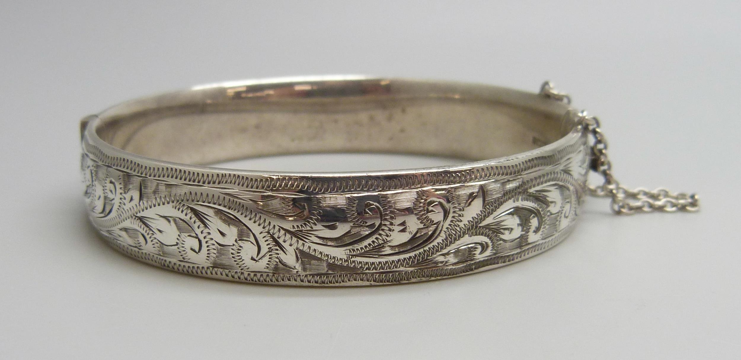 A hallmarked engraved silver bangle, 23g, 6 x 5cm